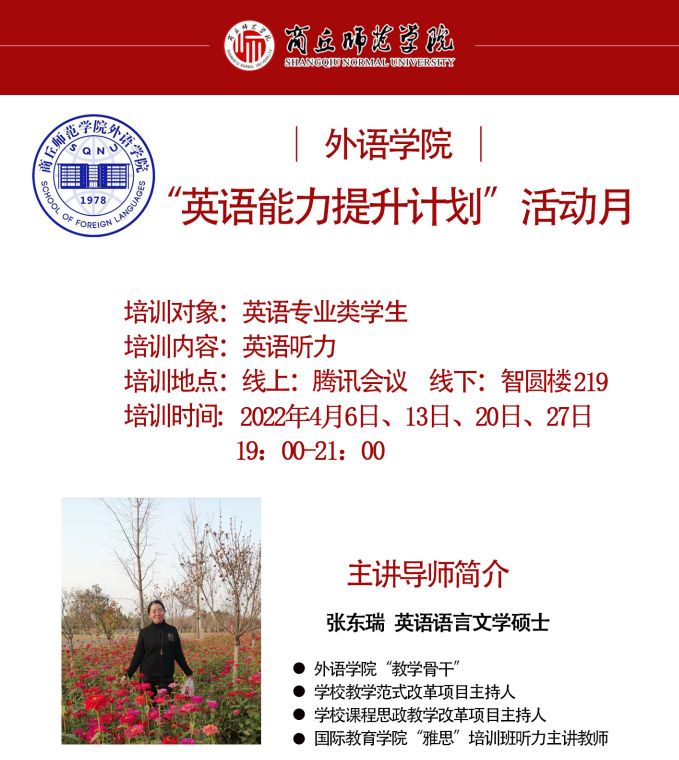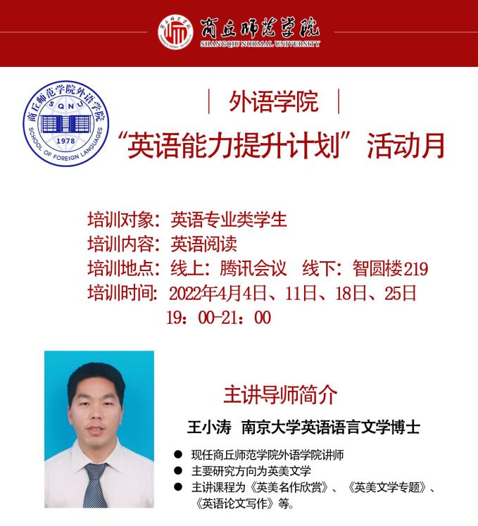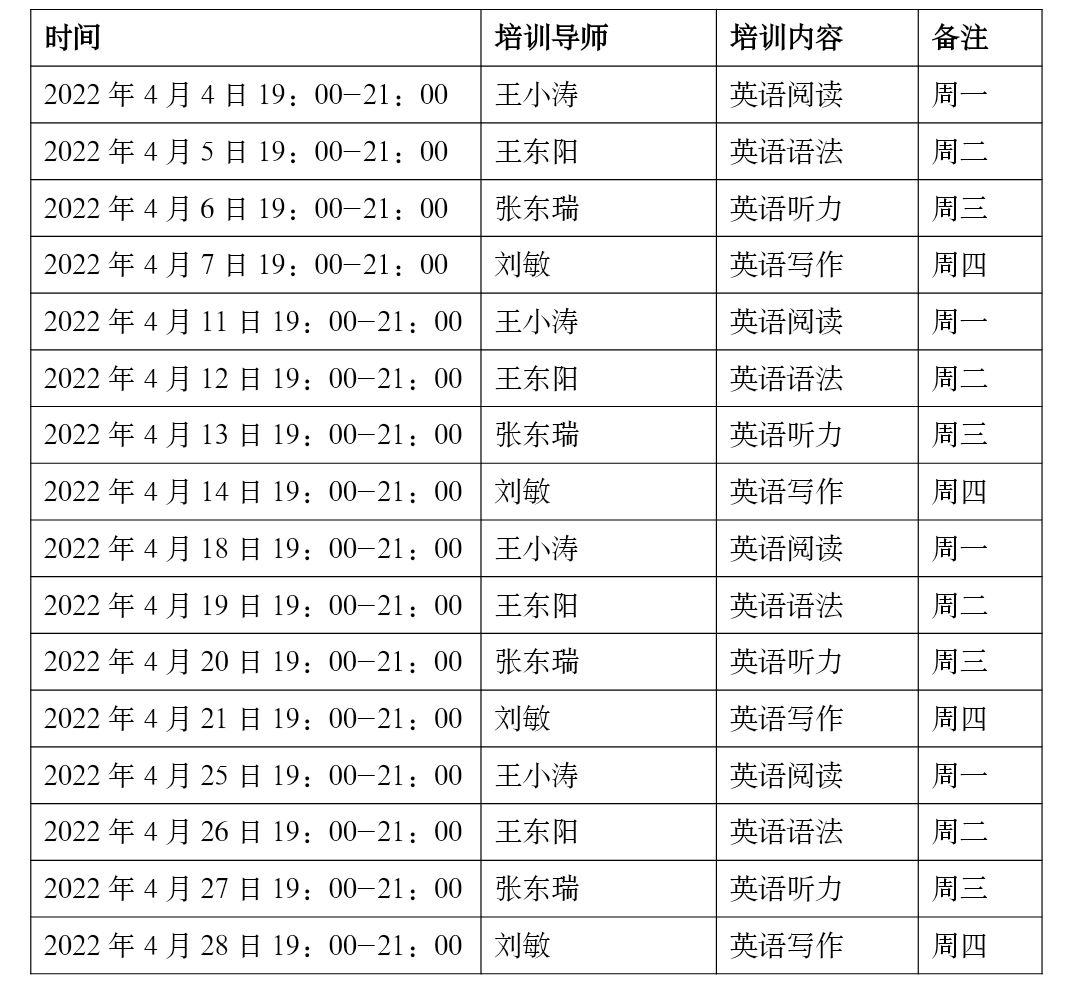 活动计划利用四周时间对2020级英语类专业学生进行英语听力、阅读、语法、写作等方面的专业技能进行指导和针对训练。邀请的主讲导师有:王小涛老师,负责英语阅读教学;刘敏老师,负责英语写作教学;张东瑞老师,负责英语听力教学;王东阳老师,负责英语语法教学。