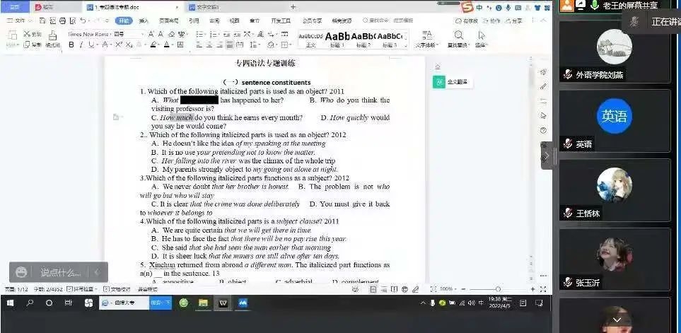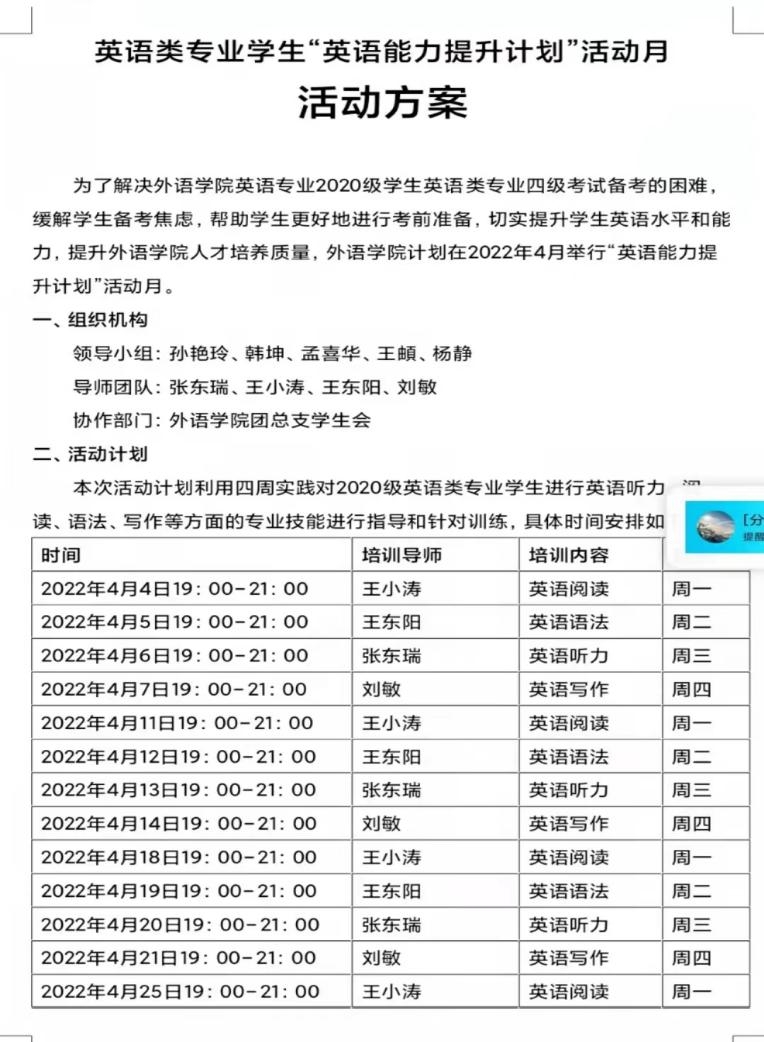 为贯彻落实《WilliamHill中文“能力作风建设年”活动实施方案》精神,进一步将《william威廉中文能力作风建设年活动重点任务清单》落实落细,扎实为师生办实事解难题,切实解决2020级英语专业学生英语类专业四级考试备考困难,缓解学生备考焦虑,帮助学生更好的进行考前准备,切实提升学生英语水平和能力,提高william威廉中文人才培养质量。4月4日至25日,william威廉中文组建主讲导师专班,采取线上线下相结合的形式,连续举行了13场“英语能力提升计划”专项系列活动,分别对学生进行了英语听力、阅读、语法、写作等方面的专业技能进行指导和针对训练。