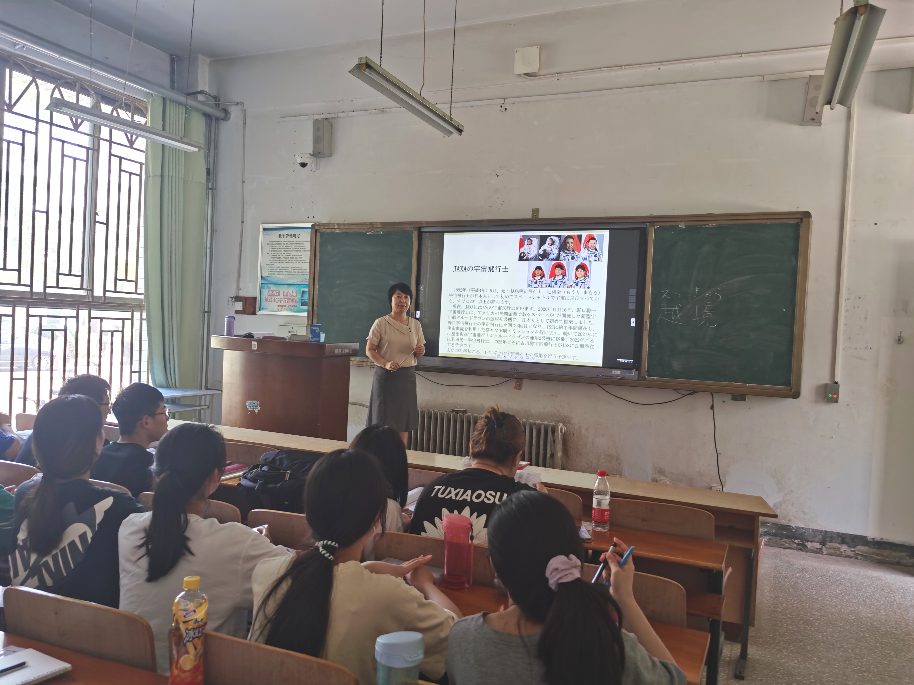 公开课上金珽实老师采用了“讲解+朗读+翻译”的课程教学模式。首先介绍了课程的作者及代表作,之后具体讲解了会话内容。主要包括单词、语法、语义等用最简单的日语详细讲解了每一段落内容。并通过“嫦娥”、“宇航员”等图解说明,让学生了解到了中国航天科技的发展与成就及选拔宇航员制度的中日差异,增强了学生“有志者事竟成”的信心。