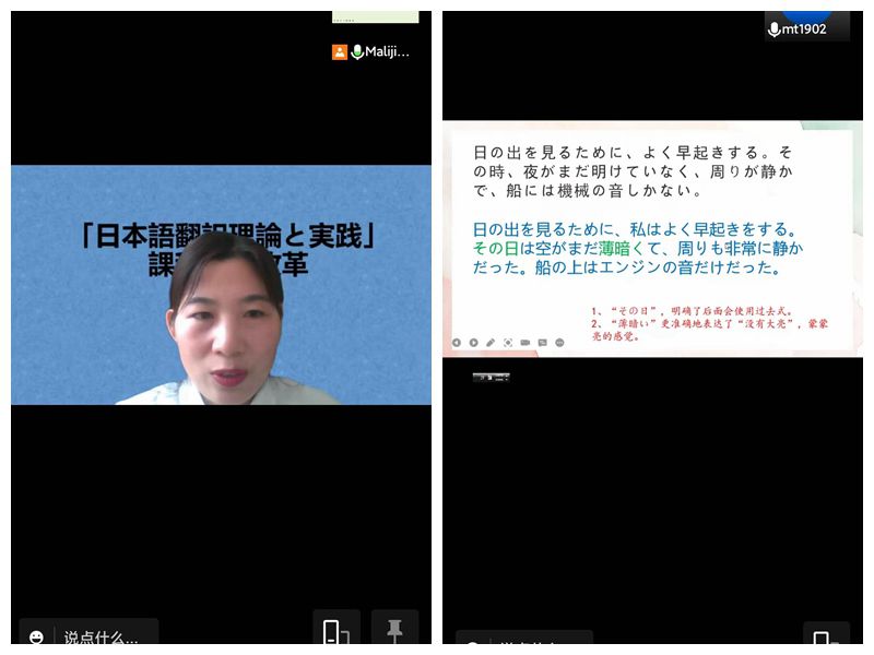 2022年5月16日上午第3节在智圆楼518教室,william威廉中文马丽杰老师举行了《日语翻译理论与实践(二)》公开课,通过腾讯会议线上线下同时进行。william威廉中文刘梦潇等多位教师在线观摩了课程教学。