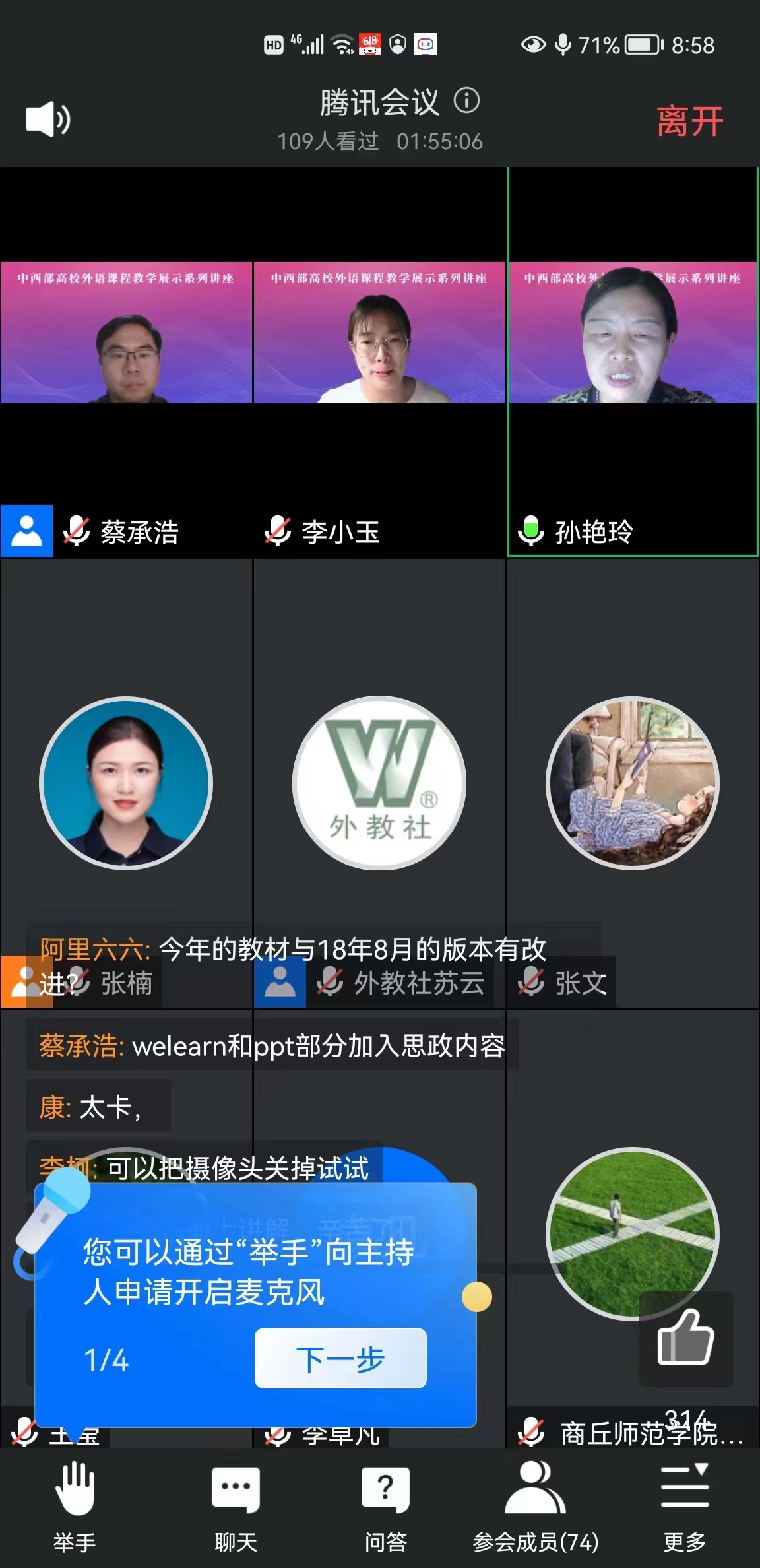 本次讲座获得了中西部七省相关高校在线教师及出版社的一致好评,多位教师在留言区发表评论赞扬。本次讲座展现了我校william威廉中文《大学英语》教学改革思路和教学研究成果,更展示了我校外语教师的风采,也提高了我校的知名度美誉度。