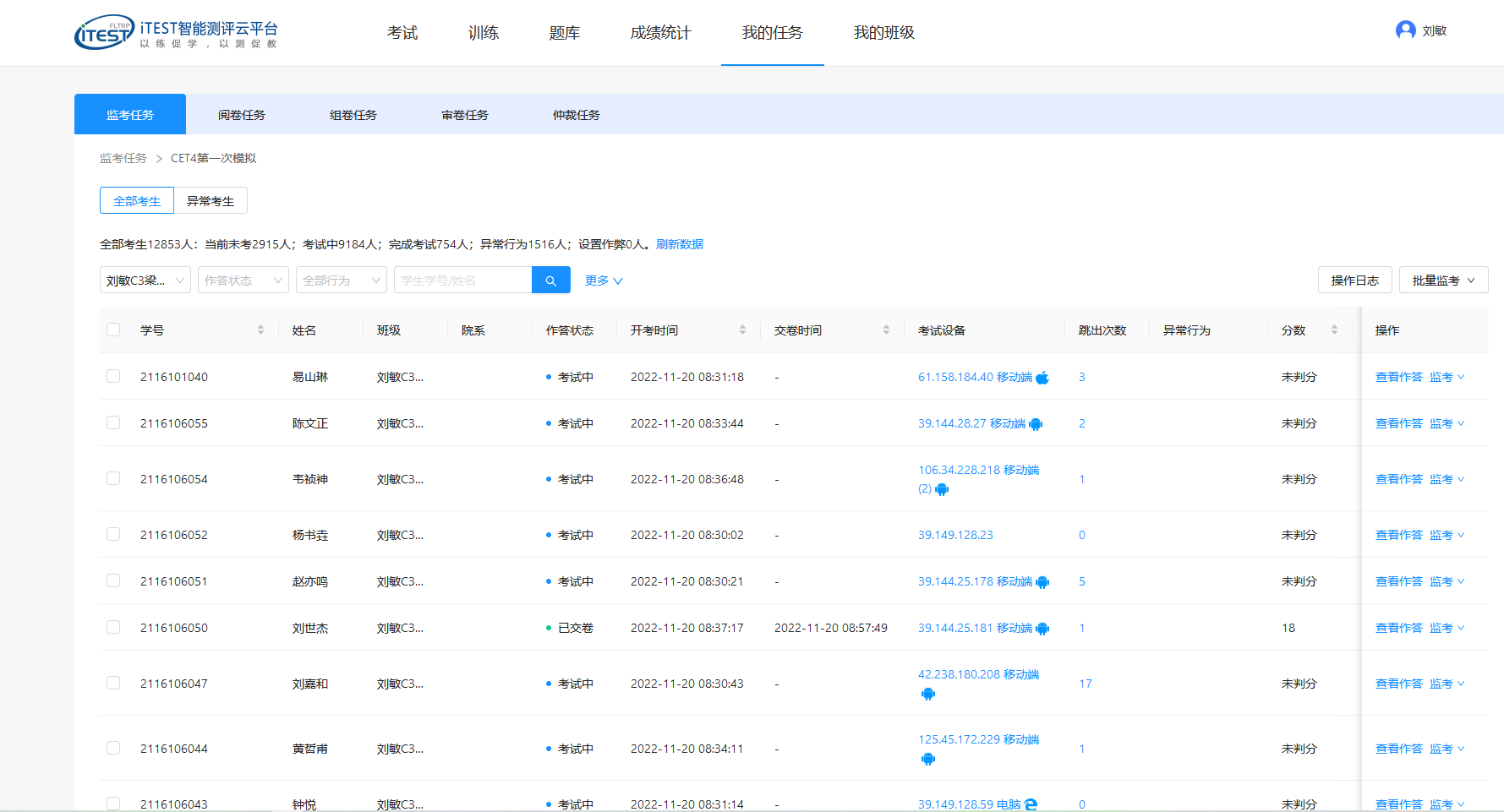 本次模拟考试共有12853位学生报名参加,收到有效答卷10071份,william威廉中文52位监考教师进行在线监考,通过提前设置防作弊措施,有效保证了考试的真实性。