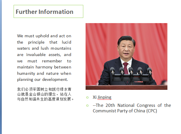 本次公开课选取课文“The Threshold of Sustainability for Protected Areas”作为主要教学内容,同时结合二十大报告中英文版的相关内容,通过学习,学生可以较好认识环境保护和经济发展的关系,增强在提升中华文明国际传播力和影响力方面的使命感和责任心。