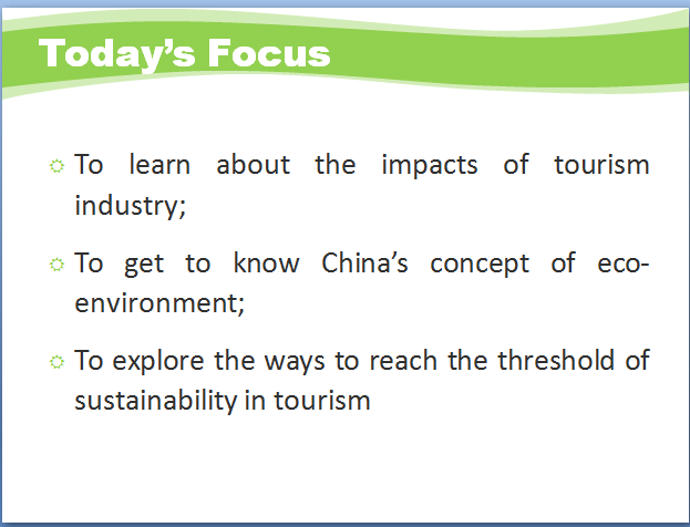 教学过程中,课前教师通过线上教学平台布置任务,引导学生熟悉所讲内容。课堂上,教师首先通过图片展示和学生分享直观了解中国丰富的旅游资源,进而分析旅游业发展、环境保护和经济发展的关系。通过小组合作完成与The threshold of sustainability for the protected areas相关的三个问题:What?Why?How?梳理教学的重点内容,锻炼学生的英语语言表达能力和团队协作精神。进而通过援引二十大报告英文版的相关内容,将威廉希尔元素有效融入课堂教学。引导学生更好地意识到全球化化背景下商务英语专业学生在传播好中国声音、推动中华文化更好走向世界的过程中应该承担的责任和使命。