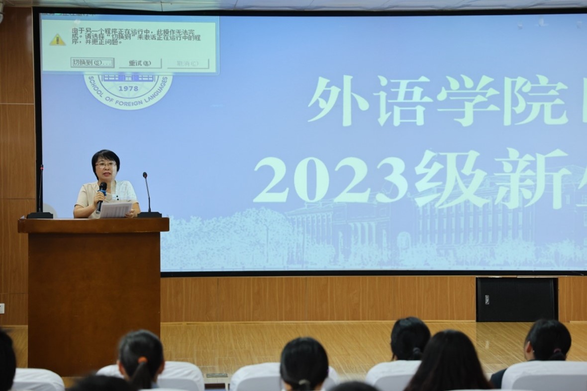 日语系主任金珽实老师做发言。她首先欢迎大家来到日语专业学习,就专业概况、师资力量、培养特色、课程设置、第二课堂、实践教学、发展前景等方面,向2023级新生们作了详细介绍。