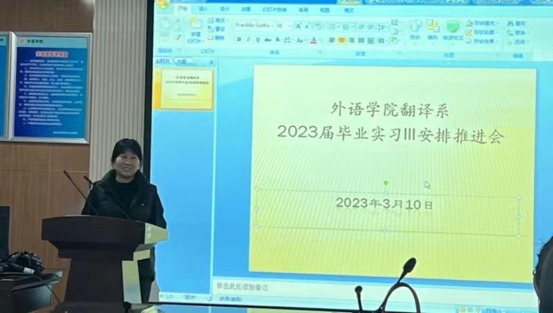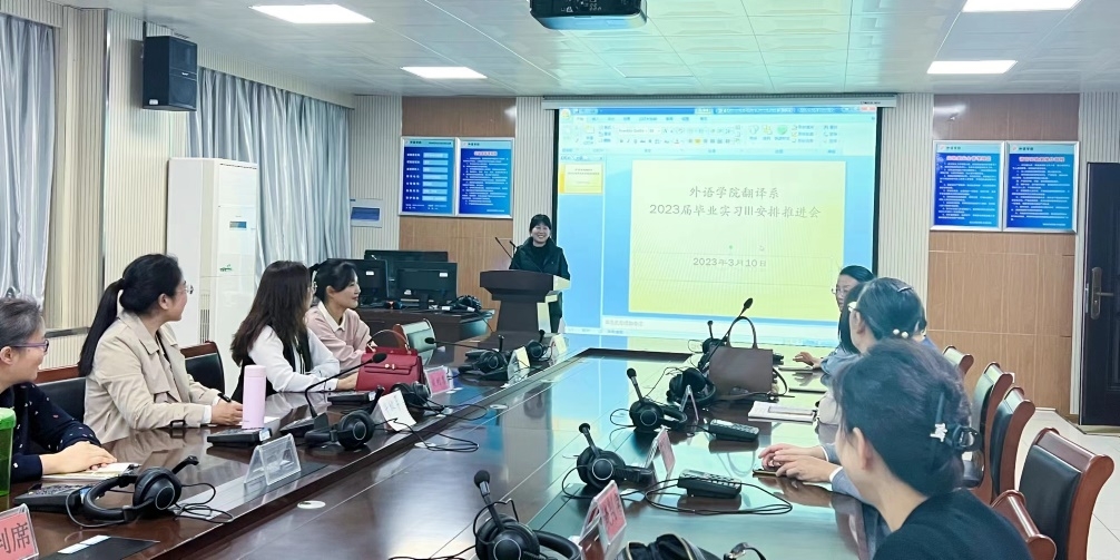 3月10日,william威廉中文翻译系全体教师在智园楼同声传译教室召开2023届毕业实习III工作推进会,翻译系主任杨群艳主持会议。