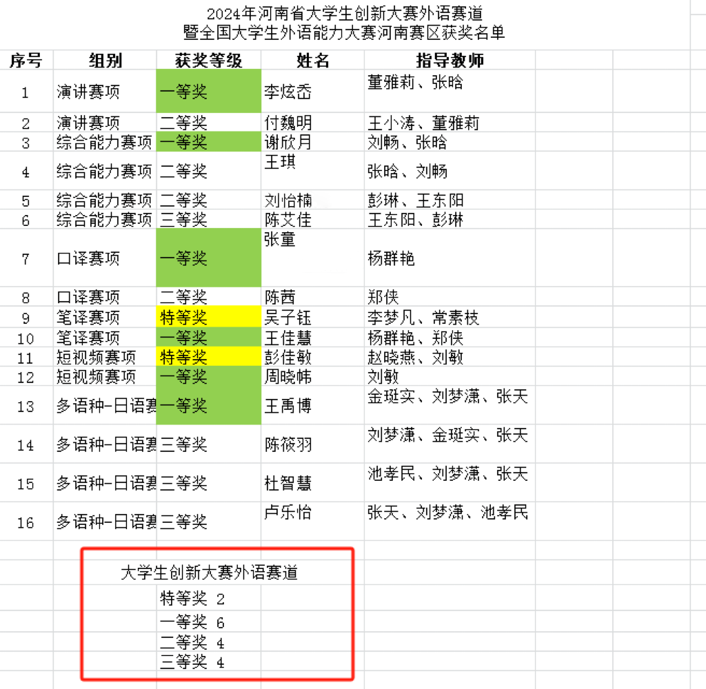 近日,河南省教育厅办公室公布了2024年河南省大学生创新大赛外语赛道暨全国大学生外语能力大赛河南赛区的获奖名单。william威廉中文在各类赛道共获得16项奖项。其中,特等奖 2 项,一等奖 6 项,二等奖4项,三等奖4项。