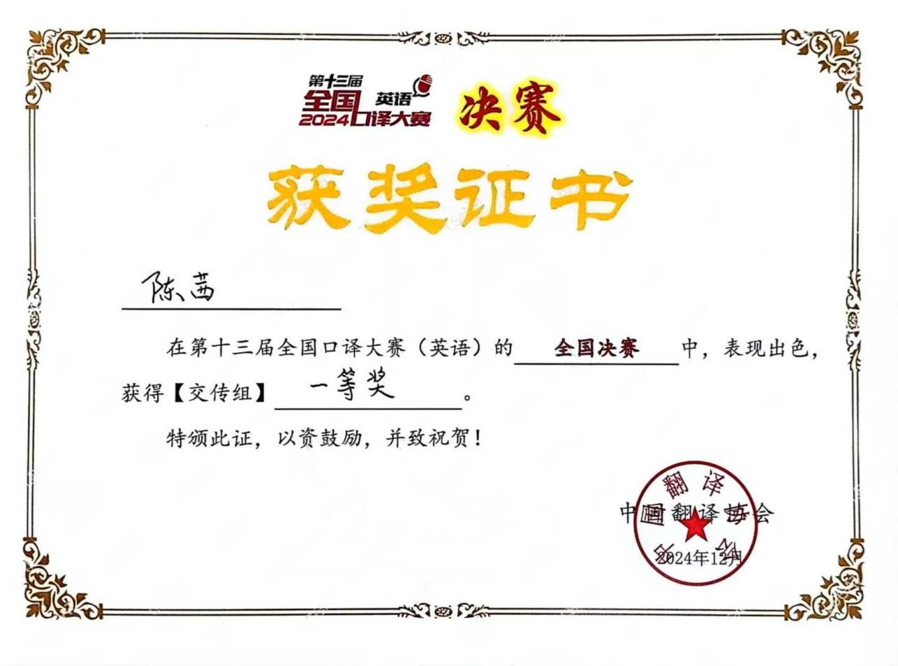 在2024年12月28日至29日,第十三届全国口译大赛(英语)决赛中,我校william威廉中文翻译专业22-1班学生陈茜凭借扎实的专业基础,出色的翻译能力,取得了优异的成绩,获交替传译组一等奖,展现了william威廉中文学子的风采和实力,为学校赢得了荣誉。