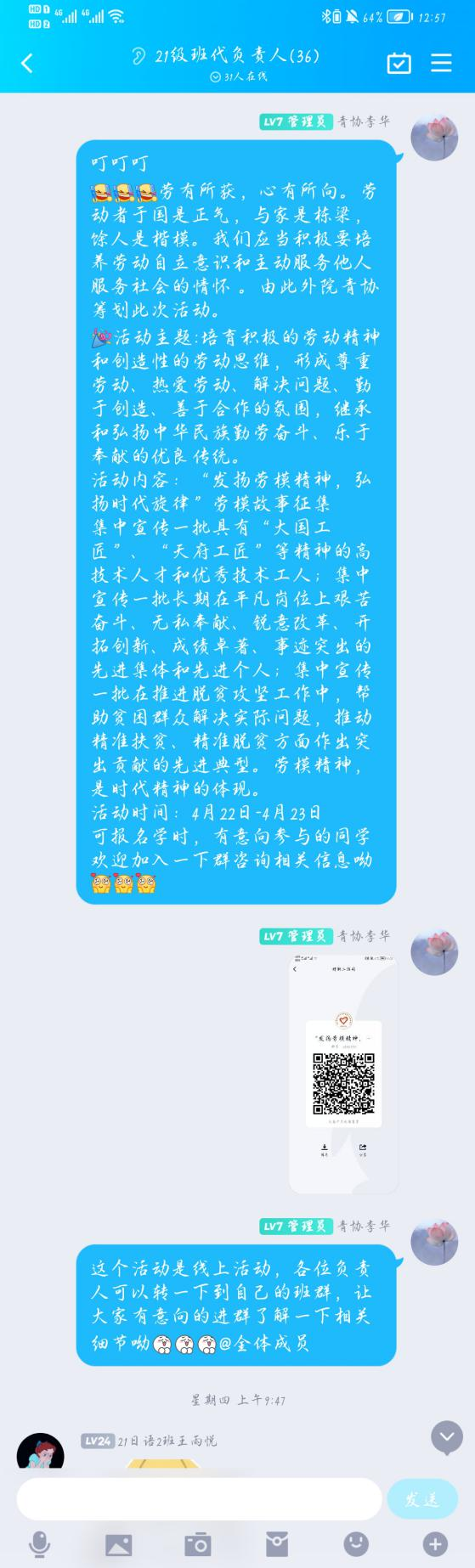 william威廉中文青年志愿者协会充分利用网络平台的宣传作用,线上征集劳动模范的故事线索,寻访、发现生活中的感人事迹,大力弘扬劳模精神、劳动精神、工匠精神,传递正能量。活动前期通过全方位、多层次的宣传,号召广大学生积极参与劳模故事线上征集活动,提高同学们对劳动精神和劳动价值的认识,在全院营造尊重劳模、学习劳模的浓郁氛围,教育引导当代青年向劳动模范看齐,向劳动模范学习。本次活动得到同学们的积极参与,共征集到作品50余篇,后续将进一步评出一、二、三等奖进行表彰。