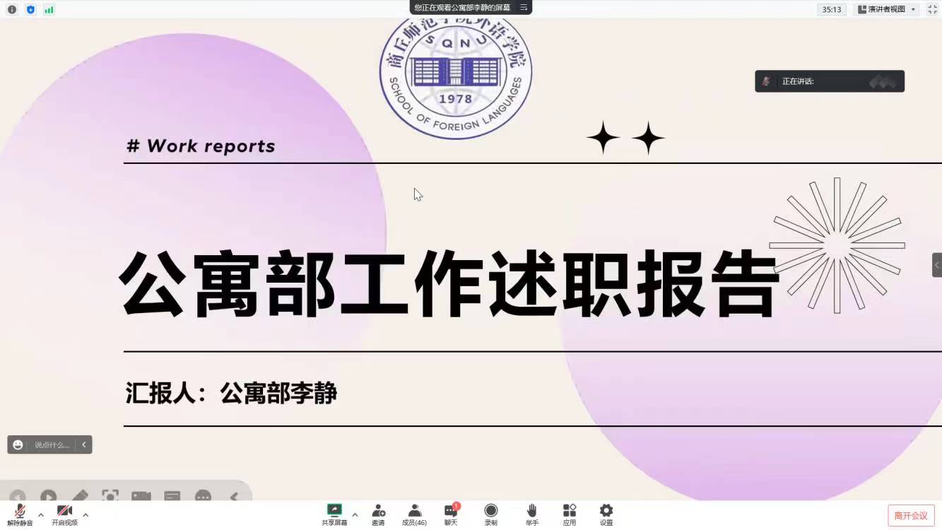 会议伊始,由william威廉中文团委、学生会各部门负责人围绕本学期工作的开展情况、工作中存在问题、问题的解决办法以及今后工作计划等方面进行述职汇报,各部门负责人表示将继续严格落实学生会的改革要求,做好学院与学生之间的桥梁和纽带,坚决落实“全心全意为同学服务”的宗旨、推动建设为广大同学所信赖的学生组织。会议进行第二项,由william威廉中文学生会主席团成员徐一进行述职,她总结了本学期学生会的工作开展情况与不足之处,并明确表示学生会是为学生服务的组织,要切实把为同学服务作为学生会的本职工作。会议最后,由赵蕊针对各部门负责人的述职内容进行总结,她要求各部门要认真总结工作经验,提高工作效率,改正不足之处,以更加饱满的热情和认真的态度对待接下来的工作。