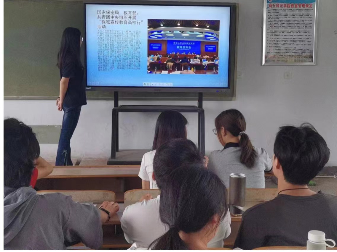 各团支部通过集体学习、观看保密警示教育片等方式开展了主题明确、内涵丰富的团日活动。各班团支书通过列举泄密的反面典型案例,并结合案例对同学们进行警示教育,对日常学习生活中如何正确使用互联网,怎样预防微信、QQ等可能造成的泄密风险,以及交友软件的使用注意事项等方面进行了详细讲解。同时强调,青年大学生应切实增强保守党和国家秘密的责任和意识,提高政治站位,克服麻痹思想,牢固树立保密意识和风险意识,深入查找可能存在的问题和漏洞,消除泄密隐患,守牢保密防线。