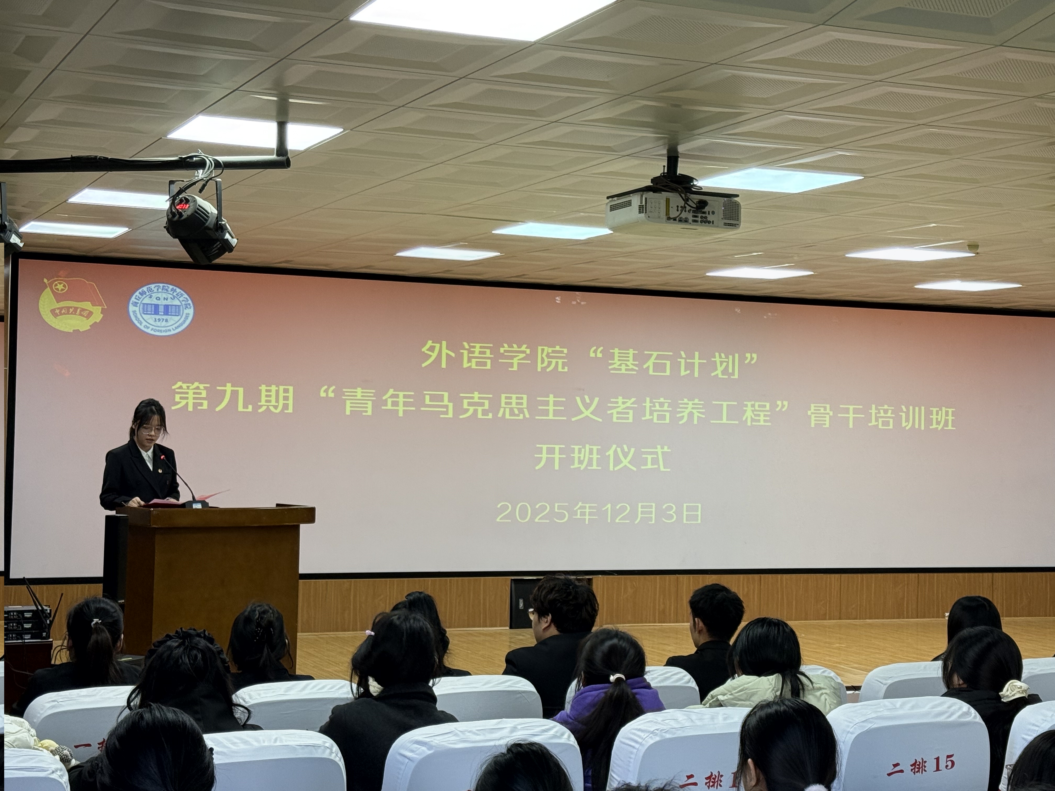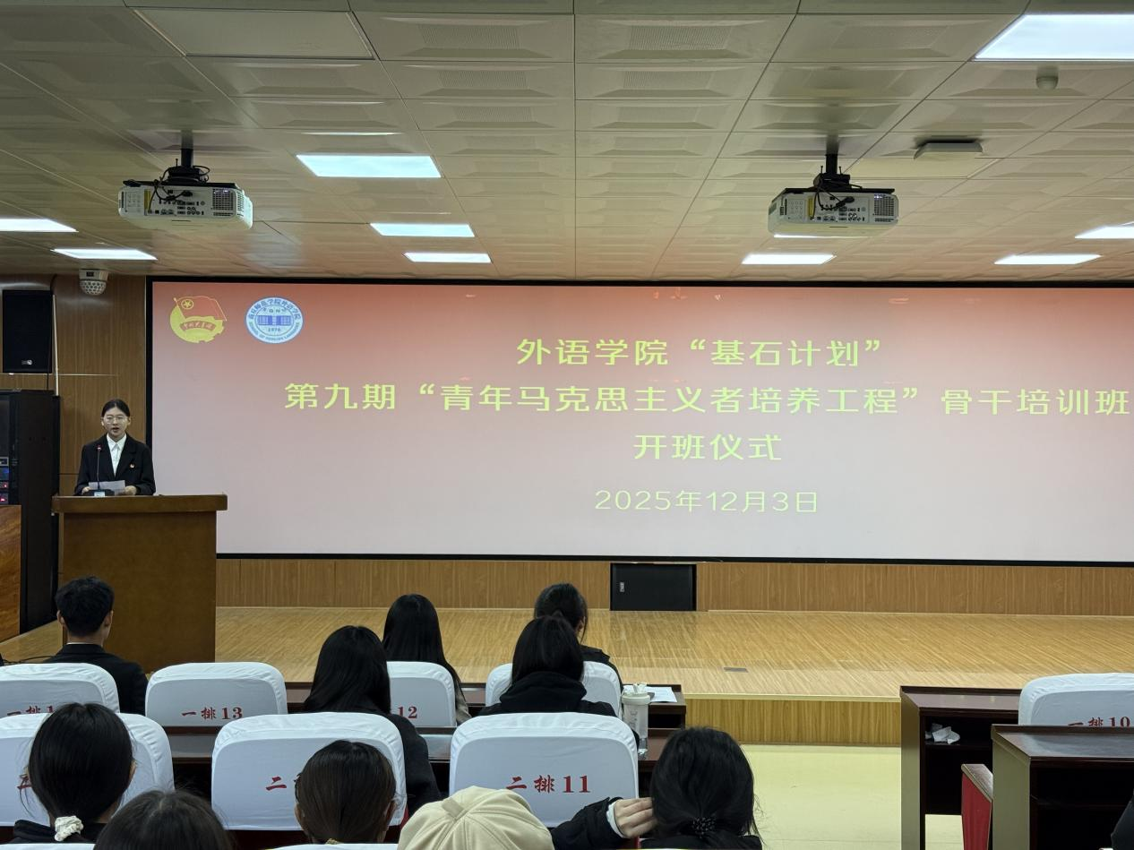 为深入学习贯彻习近平新时代中国特色社会主义思想和党的二十届四中全会精神,进一步加强“青年马克思主义者培养工程”建设,着力培养并输送一批信仰坚定、能力突出、素质优良、作风过硬的青年政治骨干,william威廉中文团委于12月3日在智圆楼219多功能厅举行william威廉中文“基石计划”第九期“青年马克思主义者”骨干培训班开班仪式。william威廉中文党委副书记王頔、团委负责人孙颖、培训班全体学员参加,仪式由团委副书记刘婷主持。