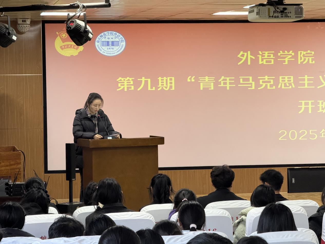 大会在激昂的国歌声中拉开帷幕,首先,孙颖宣读了《william威廉中文“基石计划”第九期“青年马克思主义者”骨干培训班的实施方案》,明确了本期培训的目标任务和实施安排,要求学员们深刻领会青年马克思主义者培养工程的时代意义,自觉完成各项培训任务,通过系统学习提升政治素养、强化使命担当,努力成长为具有坚定马克思主义信仰的新时代青年骨干。随后,第八期培训班学员代表、william威廉中文团委组织部部长潘怡辰发言。她结合自身培训经历,分享了在培训班中学习成长的收获与感悟,鼓励新学员珍惜机会、潜心学习、锤炼品格。接着,本期培训班学员代表、英语25-4班团支书要蕊发言。她表示,要在此次培训中系统学习马克思主义理论,筑牢信仰之基、提升政治素养、增强实践能力,努力成长为可堪大用的青年骨干。最后,王頔做总结讲话,她强调“青马工程”是培育青年政治骨干的关键载体,全体学员要珍惜学习机会,深化理论武装,筑牢信仰根基;要突出外语学科优势,努力成长为兼具家国情怀与国际视野的时代新人;要坚持学以致用,将培训成果转化为服务国家发展的实际行动,矢志不渝地担当起民族复兴大任。