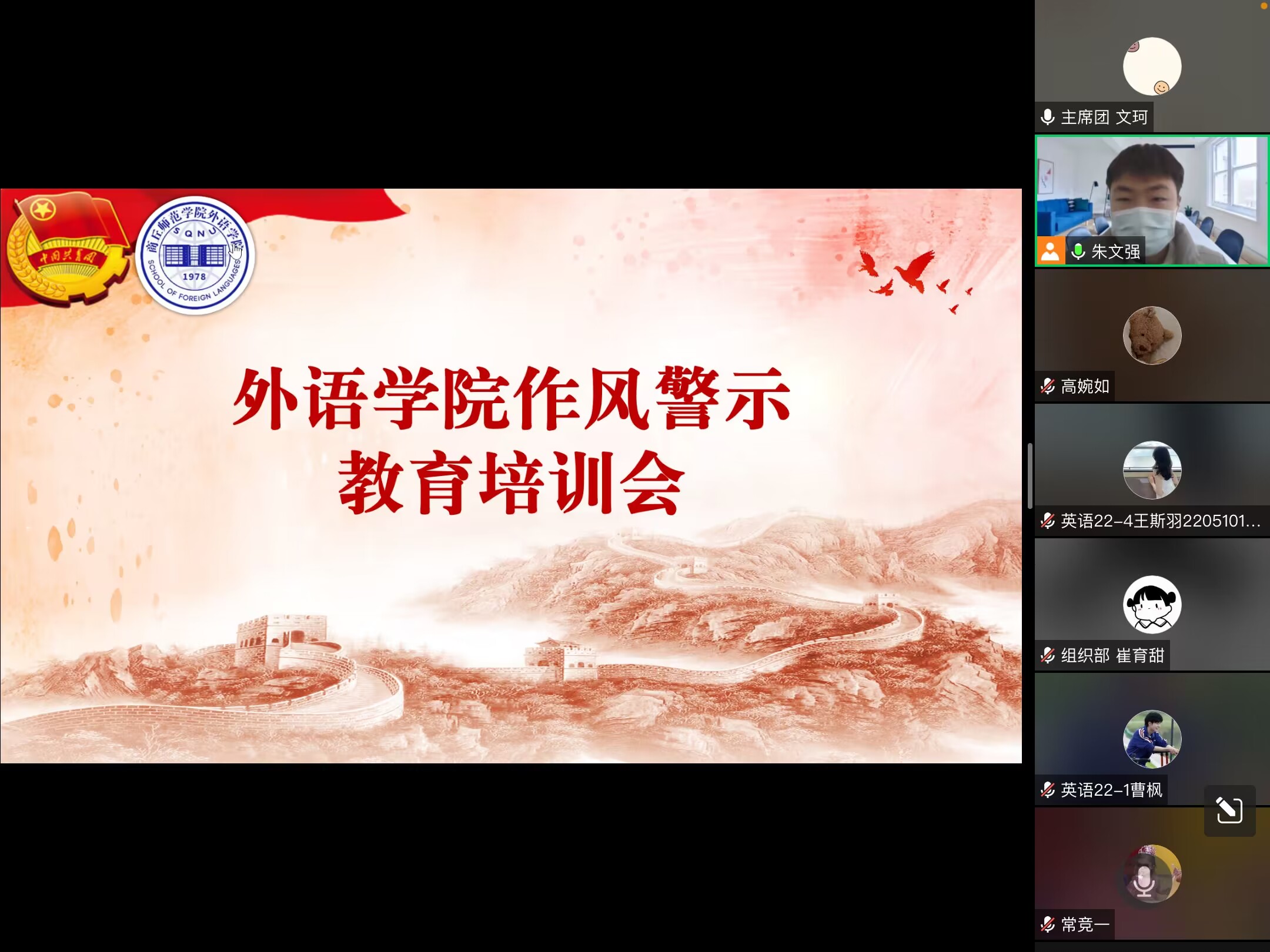 党的十八大以来,习近平总书记一直高度重视高校思想政治工作和学生组织发展,习近平总书记在党的二十大报告中再次对广大青年提出殷切期望,更加注重青年的成长成才。william威廉中文团委、学生会作为基层团学组织,要以此为契机,深化改革,升华使命。为加强学生会工作人员的能力作风建设,更好地服务于广大同学,william威廉中文团委、学生会于11月25日通过腾讯会议召开了团委、学生会工作人员作风警示培训会。团委、学生会各部门成员参加,会议由学生会执行主席朱文强主持。
