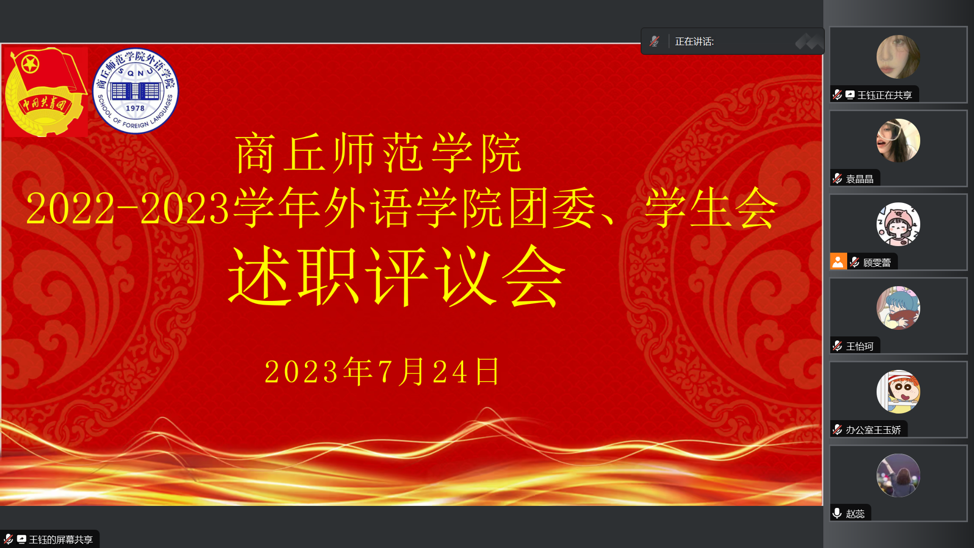 为贯彻落实《关于推动高校学生会(研究生会)深化改革的若干意见》有关要求,进一步加强对william威廉中文团委、学生会工作监督和管理,提高学生会成员的责任意识、服务意识和大局意识,william威廉中文于2023年7月24日上午通过腾讯会议召开了2022-2023学年william威廉中文团委、学生会述职评议会。参与本次会议的有william威廉中文团委书记赵蕊,学生会主席团、各部门负责人及相关成员。