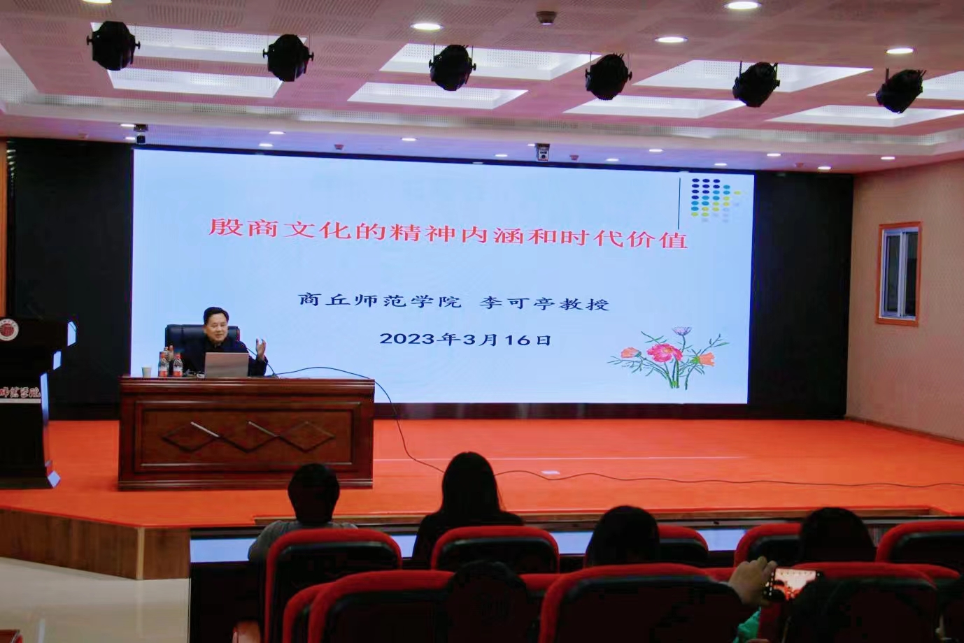 李可亭教授首先介绍了商丘文化、文化名片以及商丘的城市品牌。火文化、商文化、宋文华、木兰文化、汉梁文化、忠烈文化、黄河故道文化、廉政文化、古都城文化、根亲文化、红色文化、书院文化等商丘的著名文化名片,让参会师生感受到商丘历史文化的厚重。李可亭教授重点阐释了殷商文化的精神内涵和时代价值。灿烂辉煌的殷商文化,内容博大精深,有着丰富的精神内涵,如商汤的“日新”思想、“选贤与能”的用人原则、“有作为、敢担当”的精神等,仍然具有重要的时代价值,对于治国理政、培养人才意义重大,是我们取之不尽、用之不竭的力量源泉。