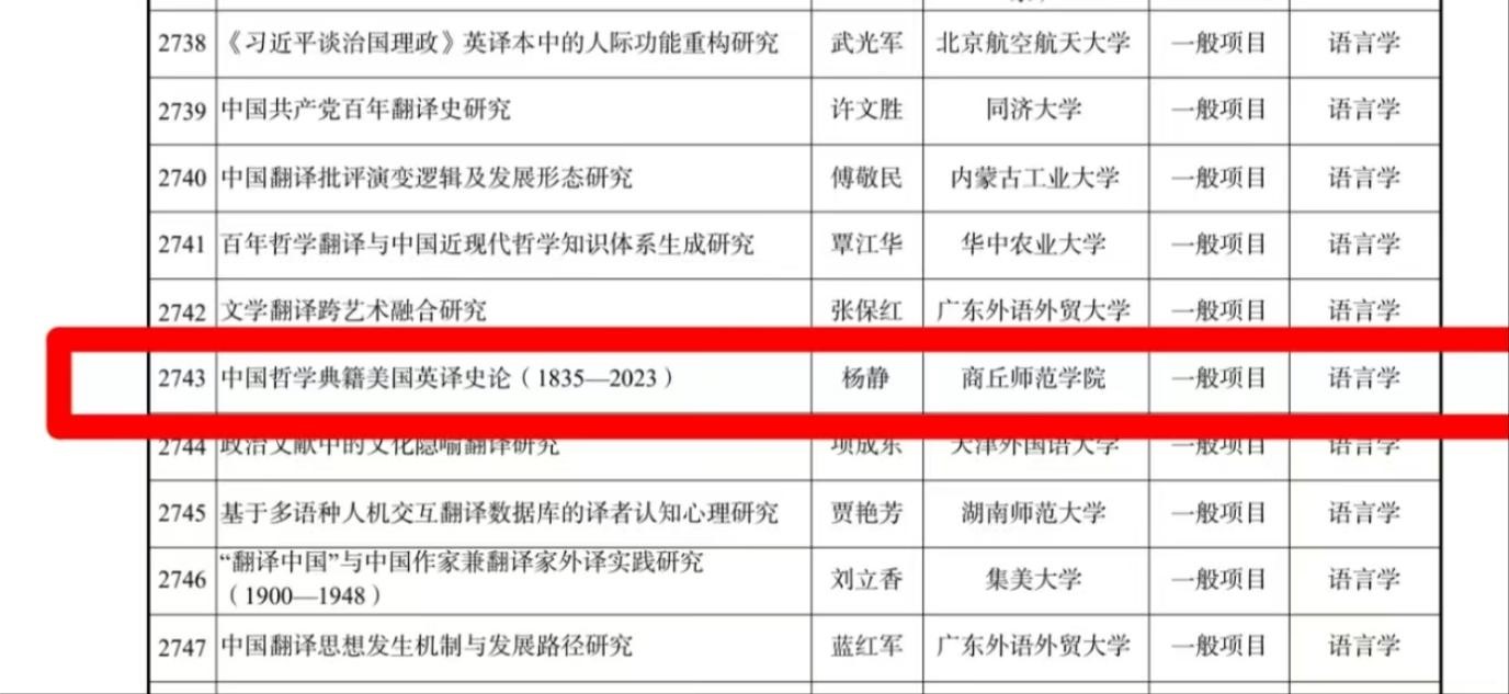 近日,全国哲学社会科学工作办公室公布了2023年度国家社科基金项目评审结果,我院副院长杨静教授主持的《中国哲学典籍美国英译史论(1835-2023)》获批立项。该项目的获批实现了william威廉中文建院(系)45年以来国家社科基金项目零的突破,也使学院科研工作迈上了新的台阶,显著提升了学院的科研层次和学术水平,对学院各项工作都起到了积极的示范引领作用。