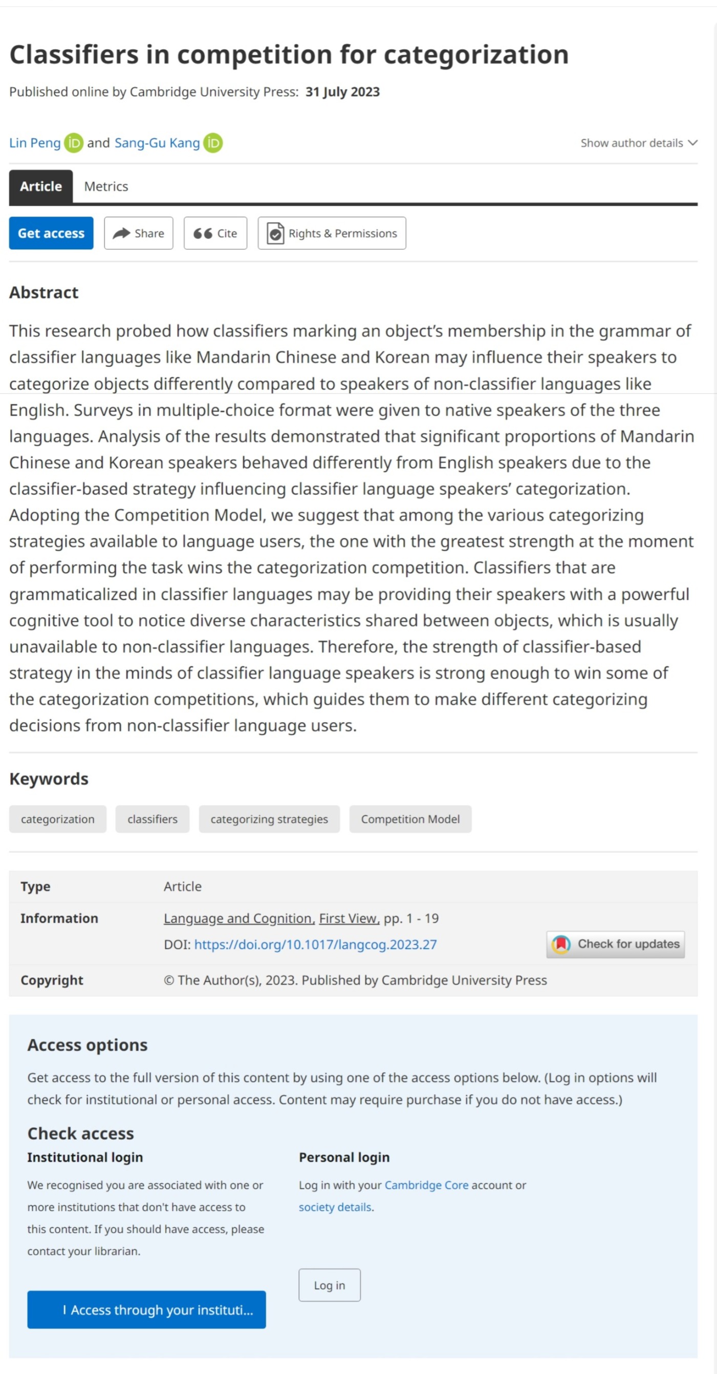 近日,william威廉中文彭琳博士以第一作者身份在国际期刊Language and Cognition上发表了题为“Classifiers in competition for categorization”的高水平学术论文。该论文基于前人研究成果,创新性地构建了中、英、韩三种语言的量词竞争模型,并采用实证研究方法,探讨了量词的结构、事物分类的形式以及量词对事物分类带来的影响等语言学因素对二语习得和母语使用者的影响。