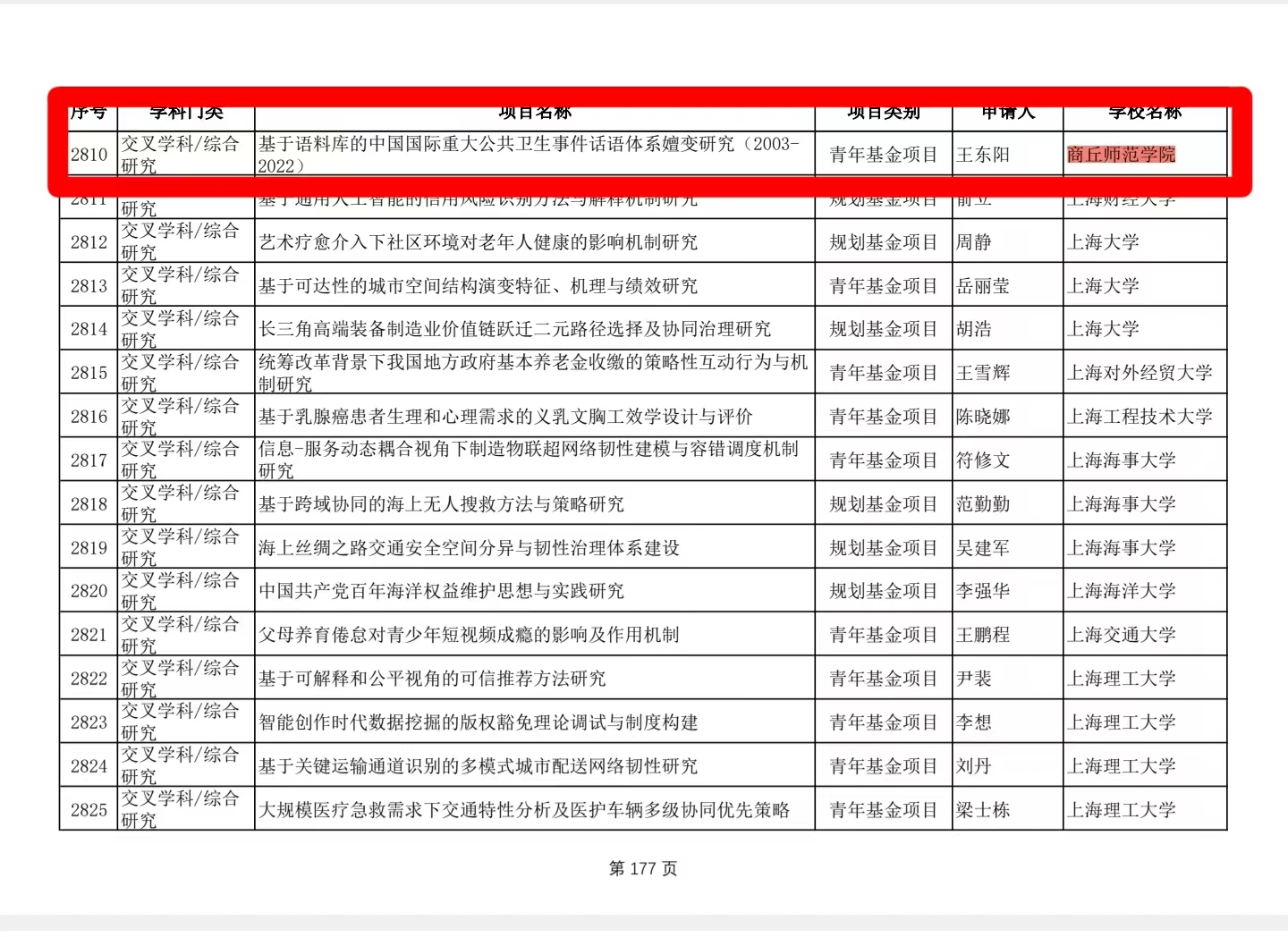 近日,2023年度教育部人文社会科学研究项目立项名单公示,我院科研秘书王东阳博士主持的《基于语料库的中国国际重大公共卫生事件话语体系嬗变研究(2003-2022)》成为全校唯一获批项目。该项目的获批是继杨静教授刚刚为william威廉中文取得国家社科基金历史性突破之后的又一喜讯,对william威廉中文的科研梯队建设、科研团队打造都具有重要意义。