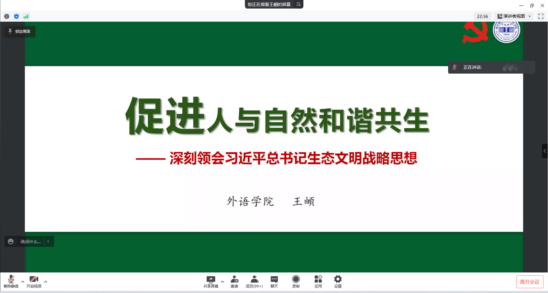 为深入学习贯彻习近平总书记生态文明战略思想,增强生态环境保护的思想自觉和行动自觉性,提高入党积极分子的思想政治素质,4月1日中午,william威廉中文党委副书记王頔通过腾讯会议的形式为2022年上半年(第50期)入党积极分子讲授《促进人与自然和谐共生》专题党课。william威廉中文203名入党积极分子参会。