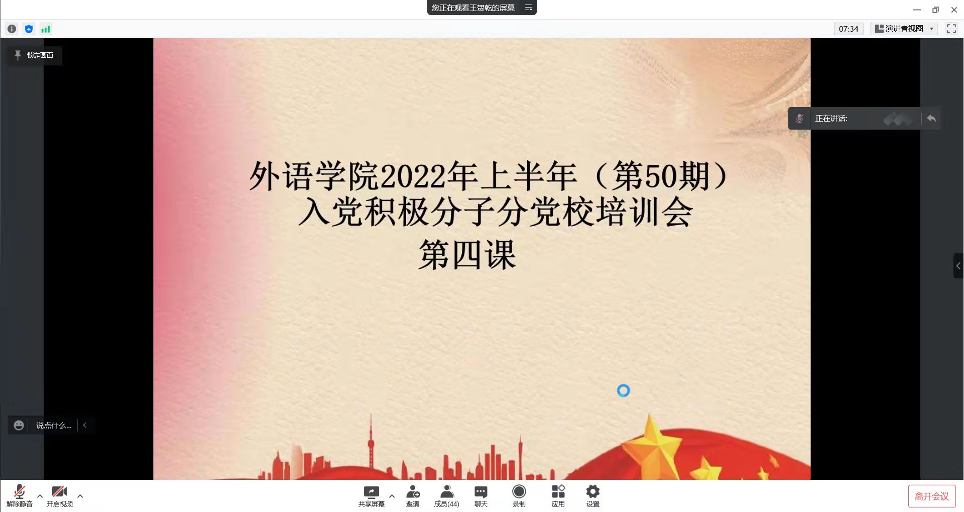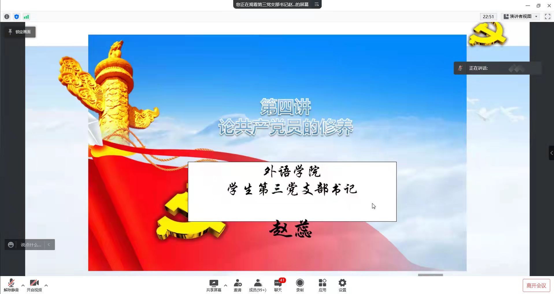 为提高william威廉中文积极分子的思想觉悟,4月6日中午,william威廉中文团委书记、学生第三党支部书记赵蕊通过腾讯会议的形式为2022年上半年(第50期)入党积极分子讲授《论共产党员的修养》专题党课。william威廉中文203名入党积极分子参会。