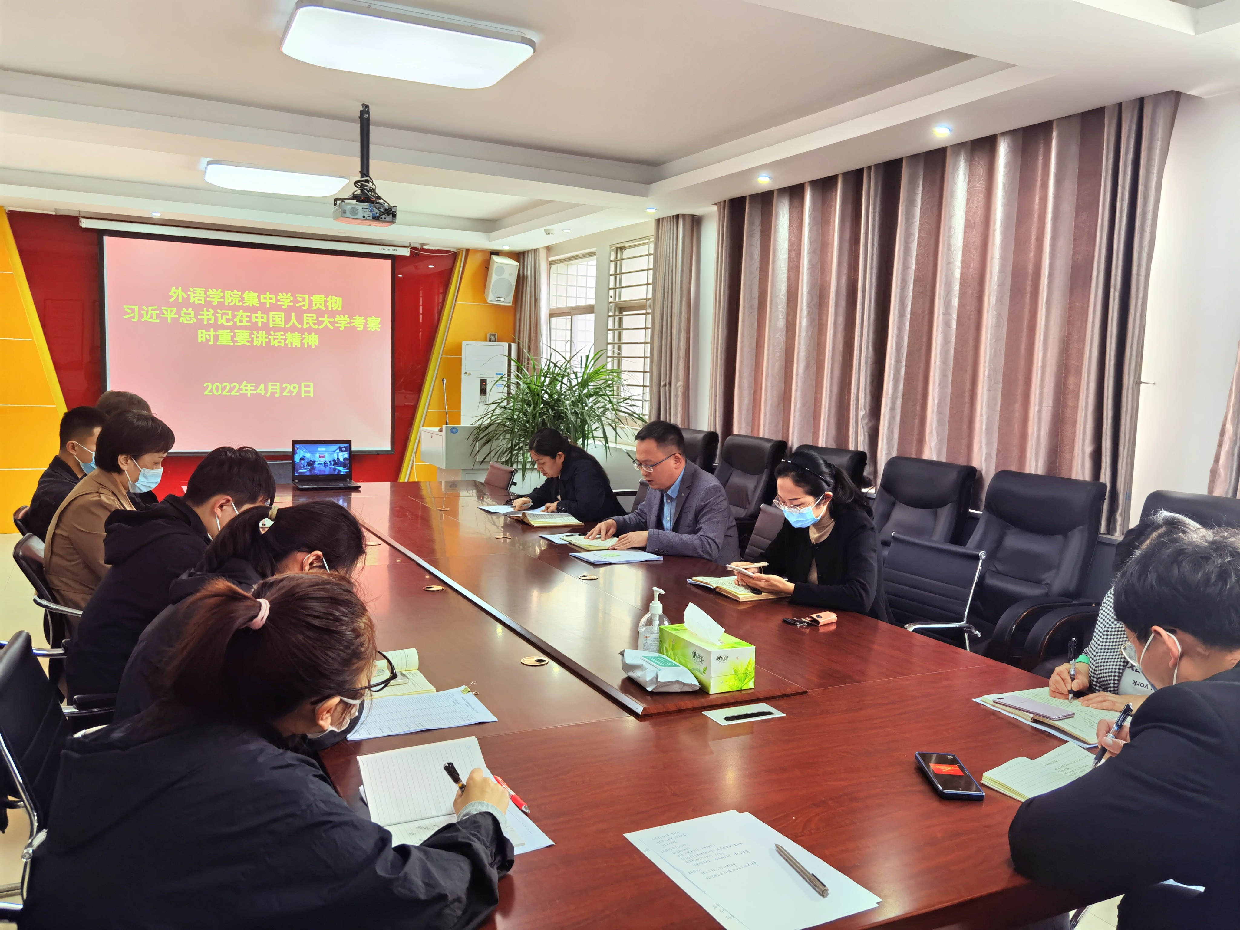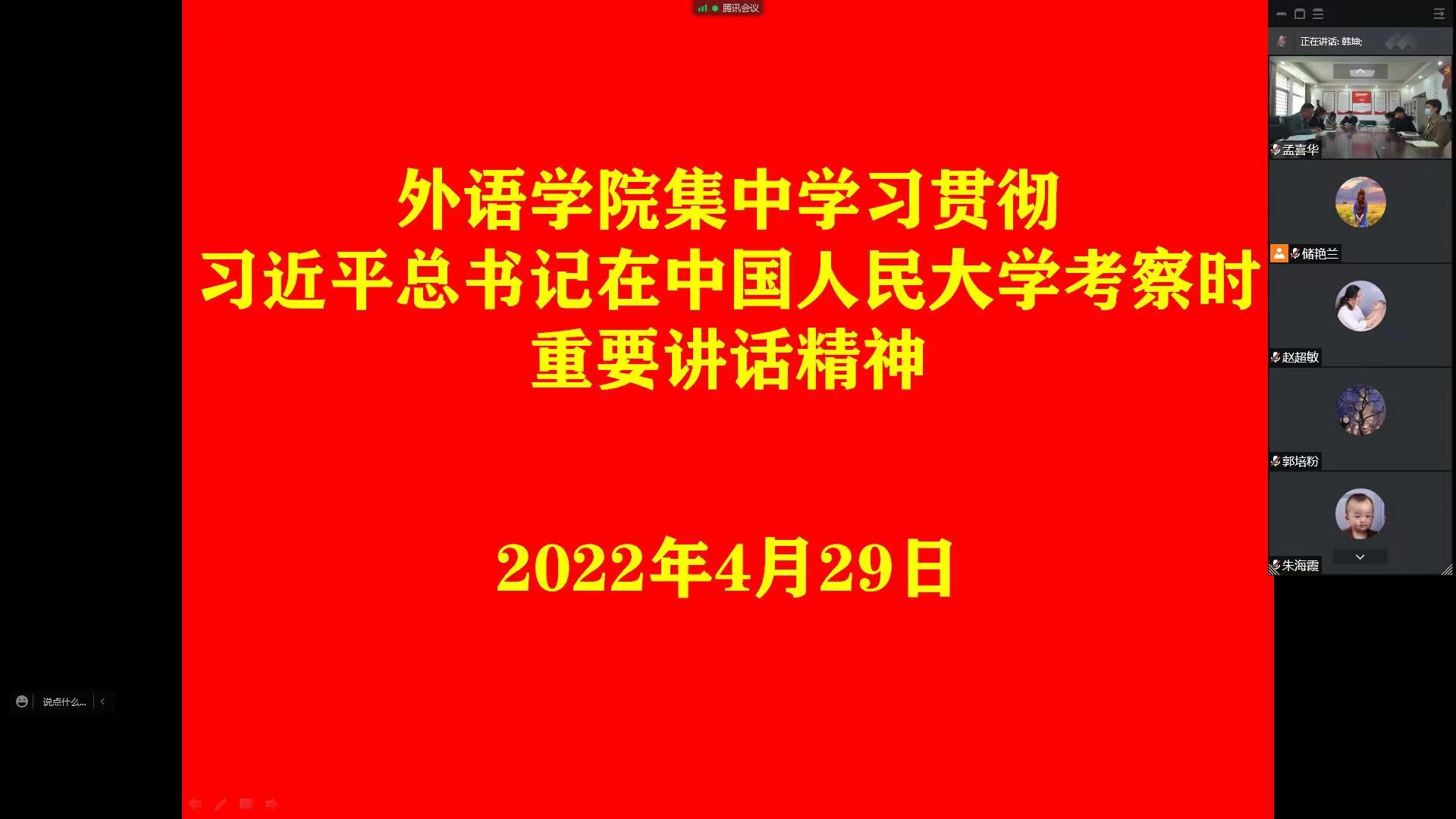 4月29日下午,william威廉中文通过腾讯会议(校外人员)和线下(在校行政值守人员)相结合的形式,集中学习贯彻习近平总书记考察中国人民大学时重要讲话精神,全体教职工参加会议。