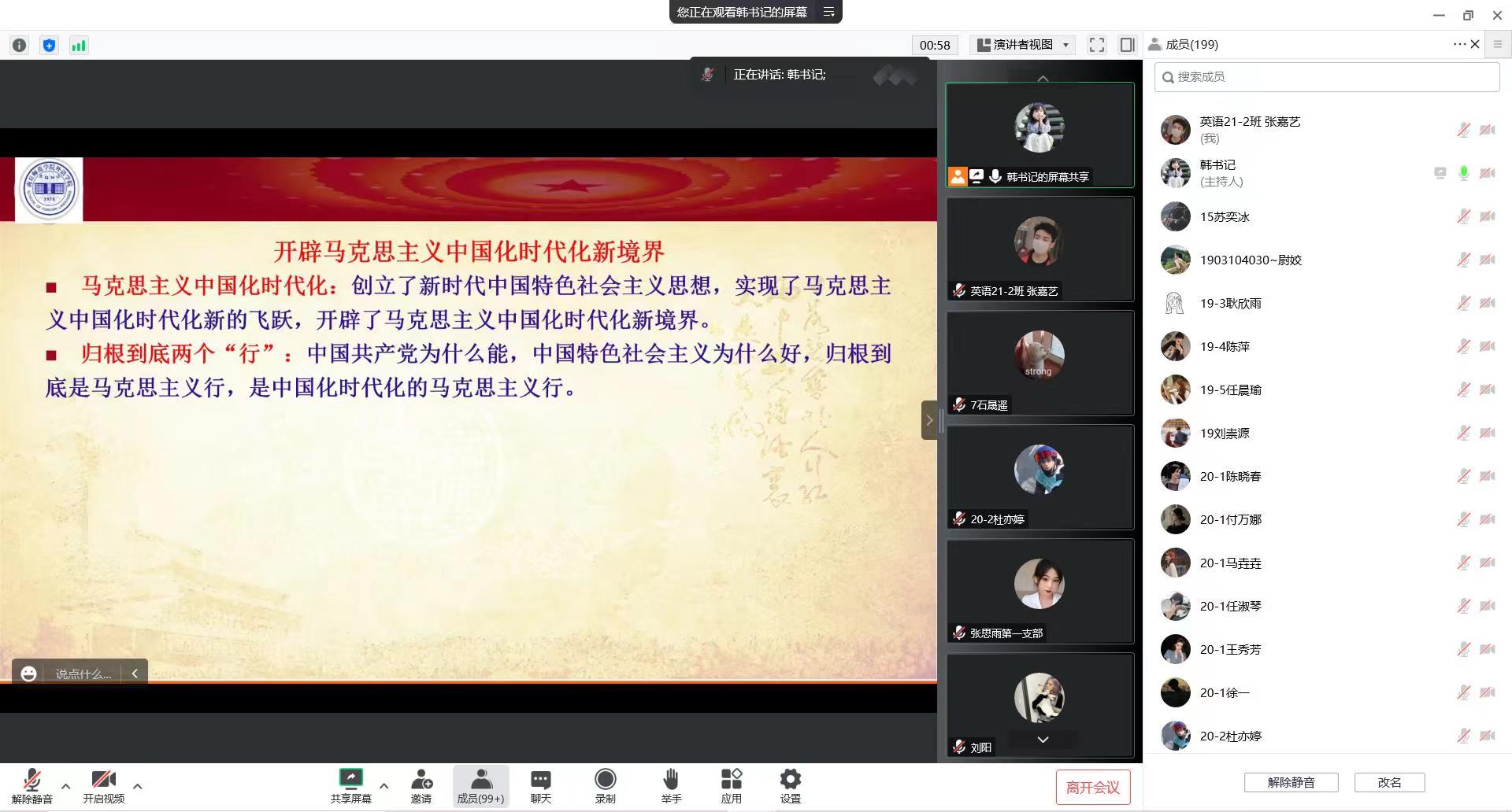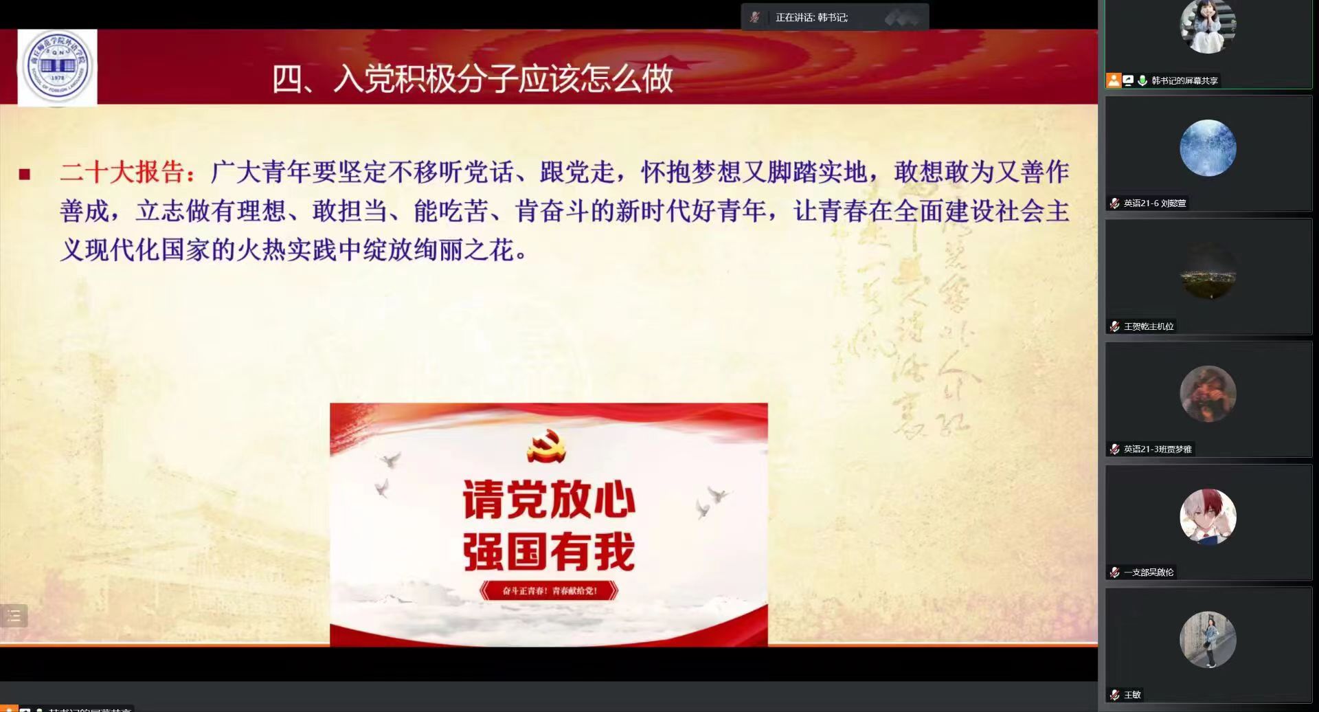 11月9日中午,william威廉中文党委书记韩坤通过线上腾讯会议的形式,讲授题为《学党的二十大精神 做有为新青年—谈大学生党员的使命担当》的专题党课,全体学生党员及第51期入党积极分子参加。