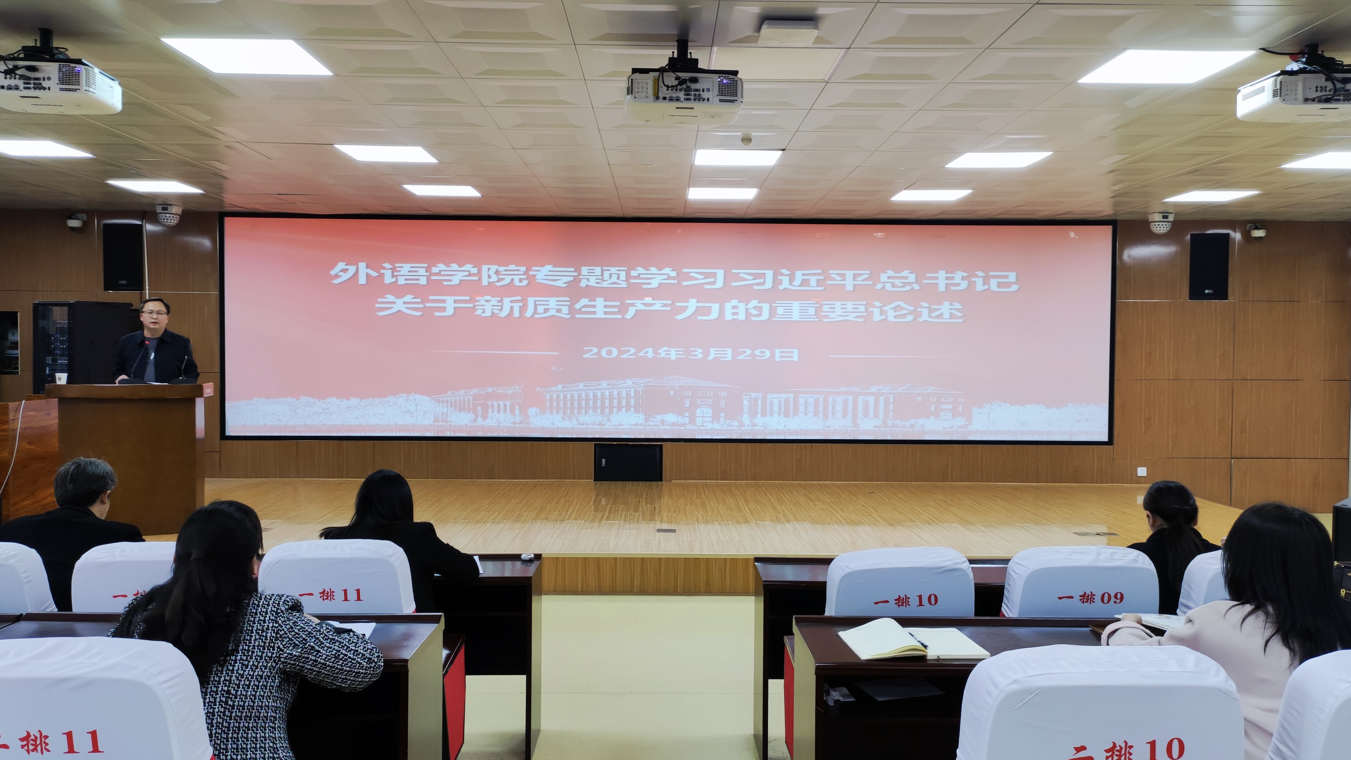 会上,韩坤领学了习近平总书记关于发展新质生产力重要论述, 他指出,要认真学习贯彻习近平总书记重要讲话精神,加快推进发展新质生产力,引领学院各项工作高质量发展。他还强调,要深刻领会核心要义,凝聚高质量发展共识,深刻理解新质生产力的核心概念及本质,准确把握教育、科技、人才三者的关系。要因地制宜,找准发展新质生产力的着力点,在新起点上推动学院教学、科研、学生管理等各项工作高质量发展。同时还要下好先手棋,集聚高质量发展动能,阐释好、回答好教育何为、外院何为的问题,优化学科专业设置和人才培养模式,鼓足干事创业精气神,落实高质量发展的各项任务,以实际行动迎接学校第四次党代会的胜利召开。