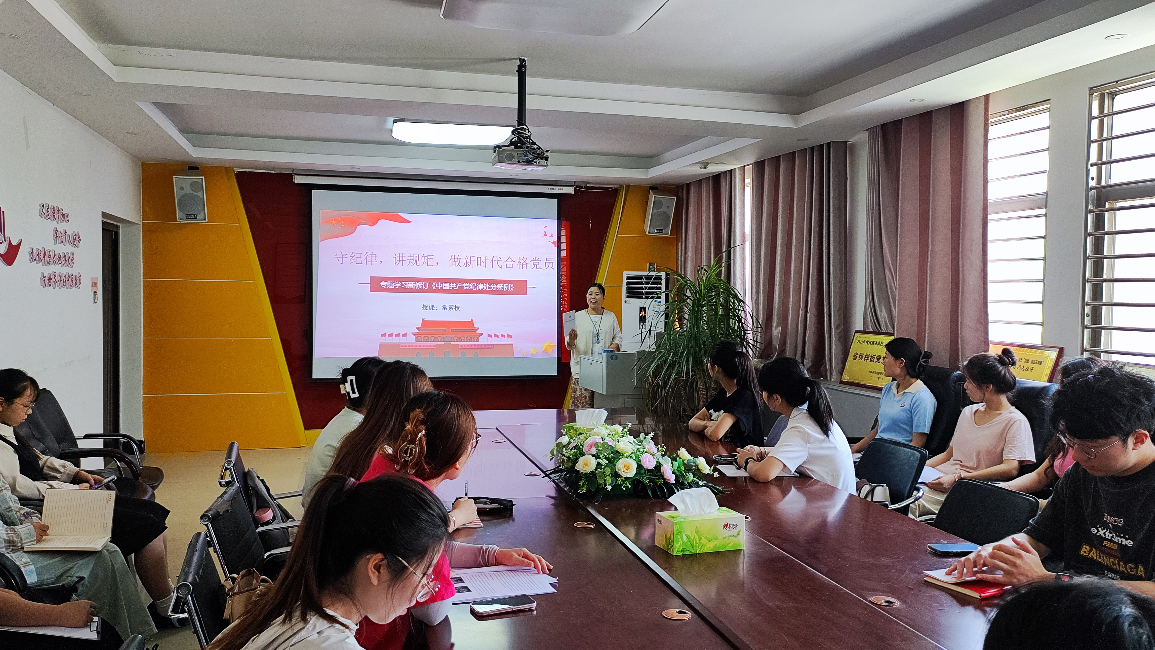 为切实提高学生党员的自律意识,5月23日中午,william威廉中文学生第四党支部书记常素枝在应天楼214会议室讲授了《守纪律,讲规矩,做新时代合格党员》专题党课,并组织预备党员学习了新修订的《中国共产党纪律处分条例》。