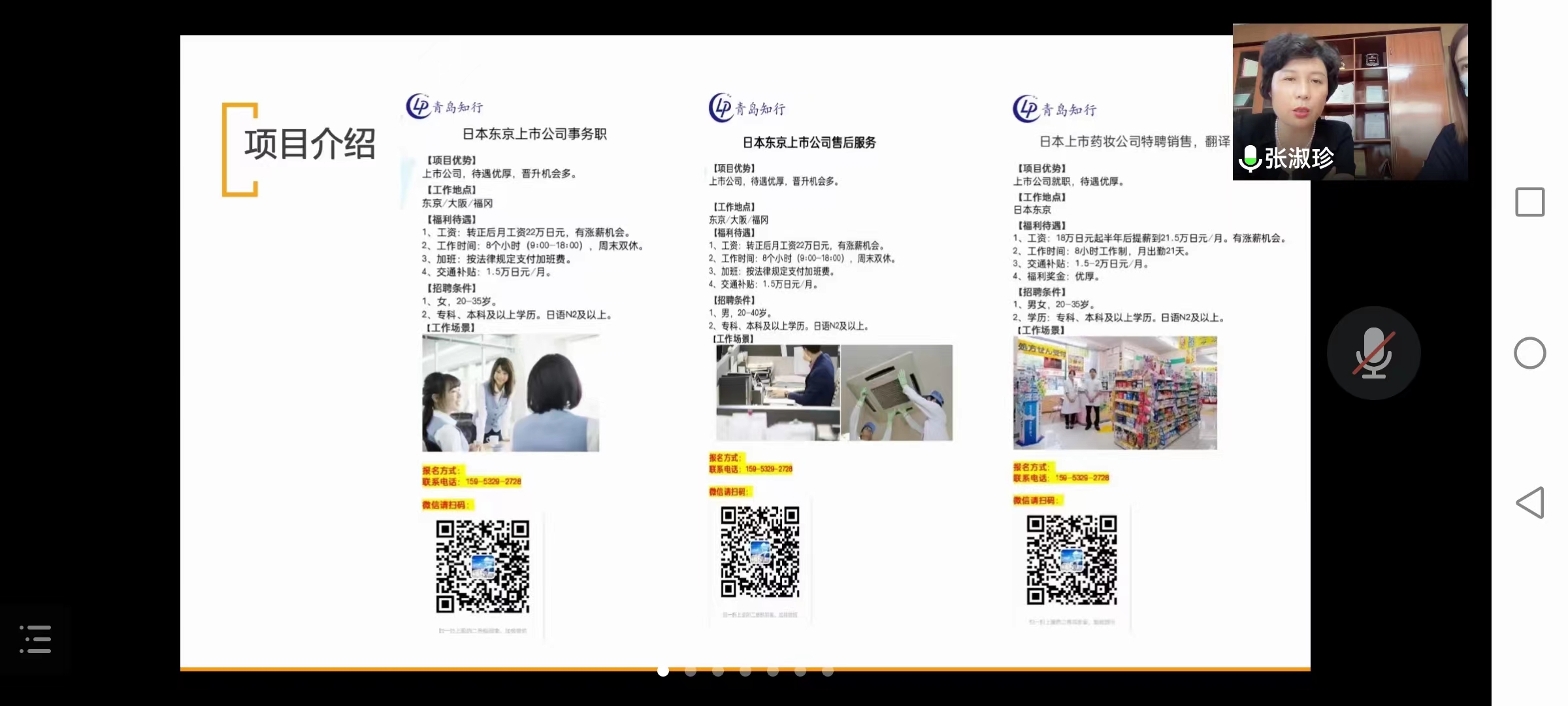 为促进william威廉中文日语专业毕业生就业,使广大毕业生了解就业形势及就业政策,5月31日下午william威廉中文日语专业举办就职宣讲会。宣讲会由william威廉中文主办、日语协会承办、青岛知行国经济技术合作有限公司主讲,宣讲采取线下和线上相结合的形式进行。日语专业主任金珽实、副主任刘梦潇及日语专业学生参加了本次宣讲会。