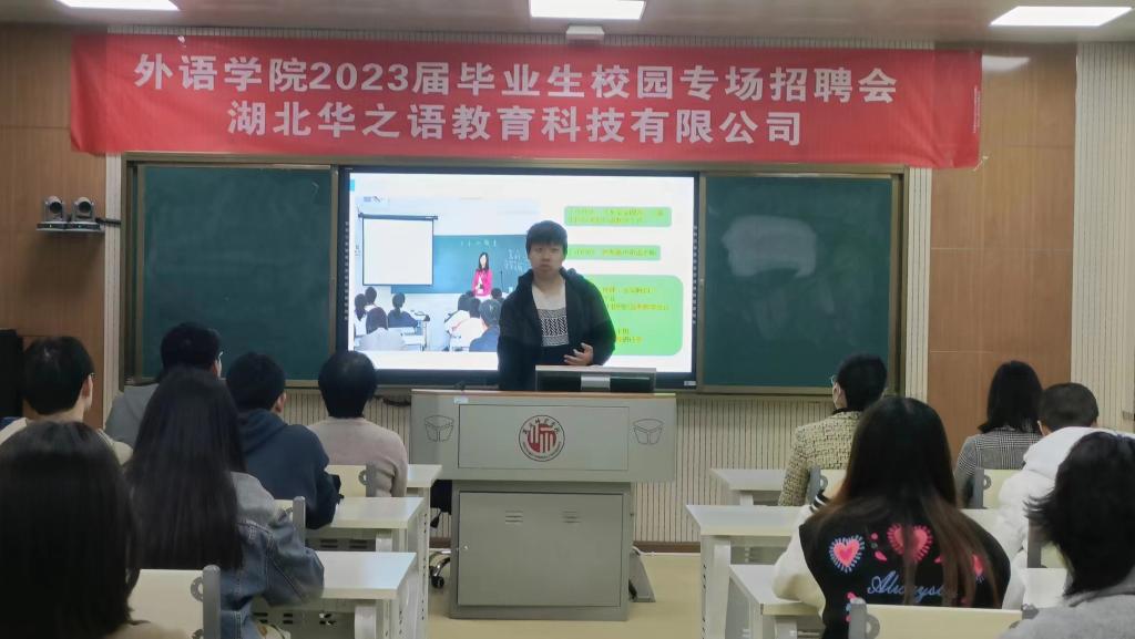湖北华之语教育科技有限公司的人事部主任屈文豪向同学们进行了招聘宣讲,他依次对公司情况、教研团队、合作高校、招聘岗位、薪资待遇等做了详细介绍。接着同学们就实习、应聘等问题与屈主任进行了现场沟通,有应聘意向的同学现场投递了简历并填写了《华之语意向登记表》,同时约定了试讲和面试时间。