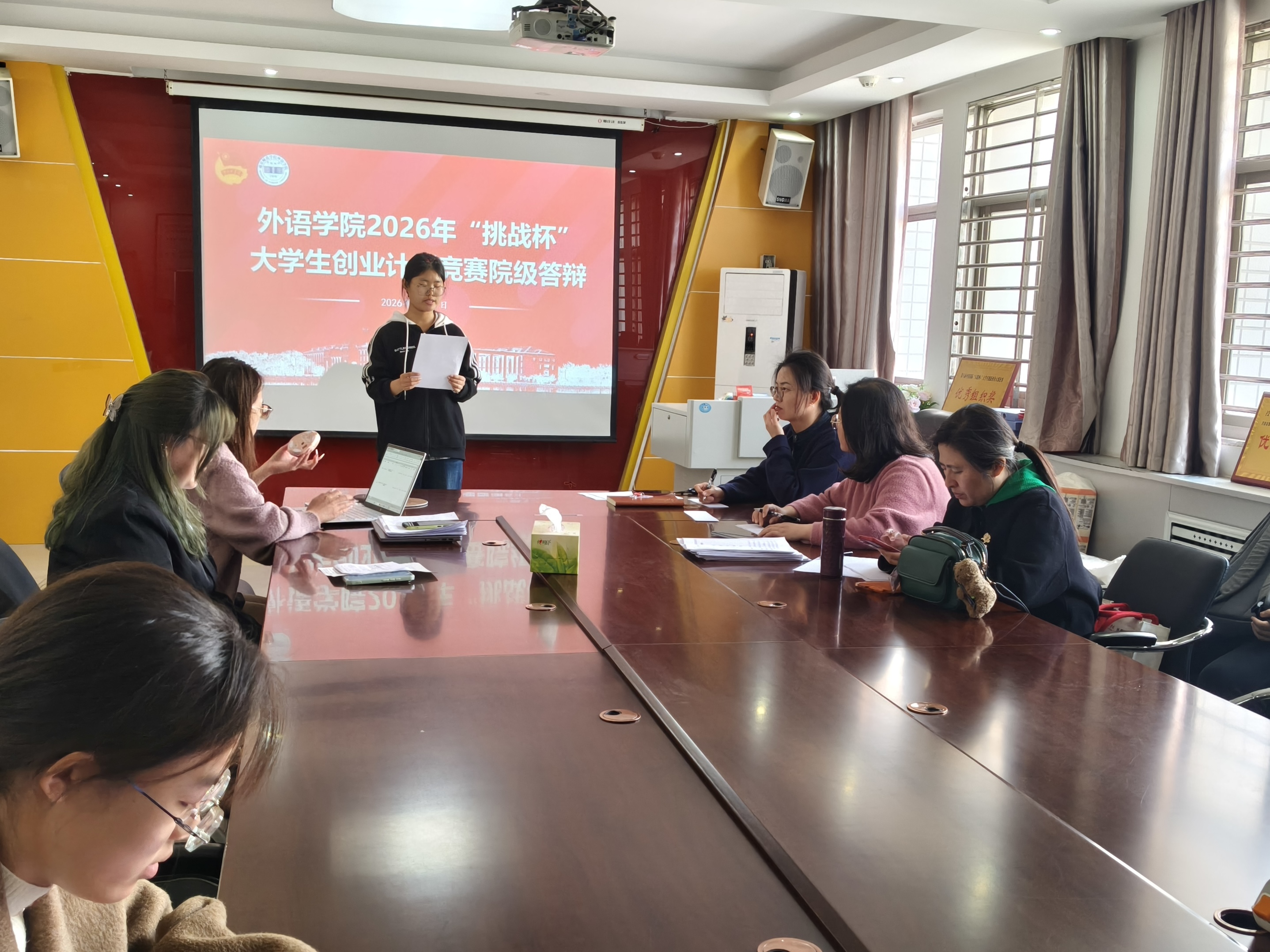 为认真贯彻落实国家双创工作部署,进一步引导和激励青年学生增强国情社情了解、激发创新精神、培育创业意识、提升创新创业能力,3月27日,william威廉中文在应天楼214会议室举办2026年“挑战杯”大学生创业计划竞赛院级答辩,学院英语系教师王晓燕、王静、团委负责人孙颖、辅导员郭继鹏担任此次答辩评委,学院学生会创新实践部部长周梦洁主持。
