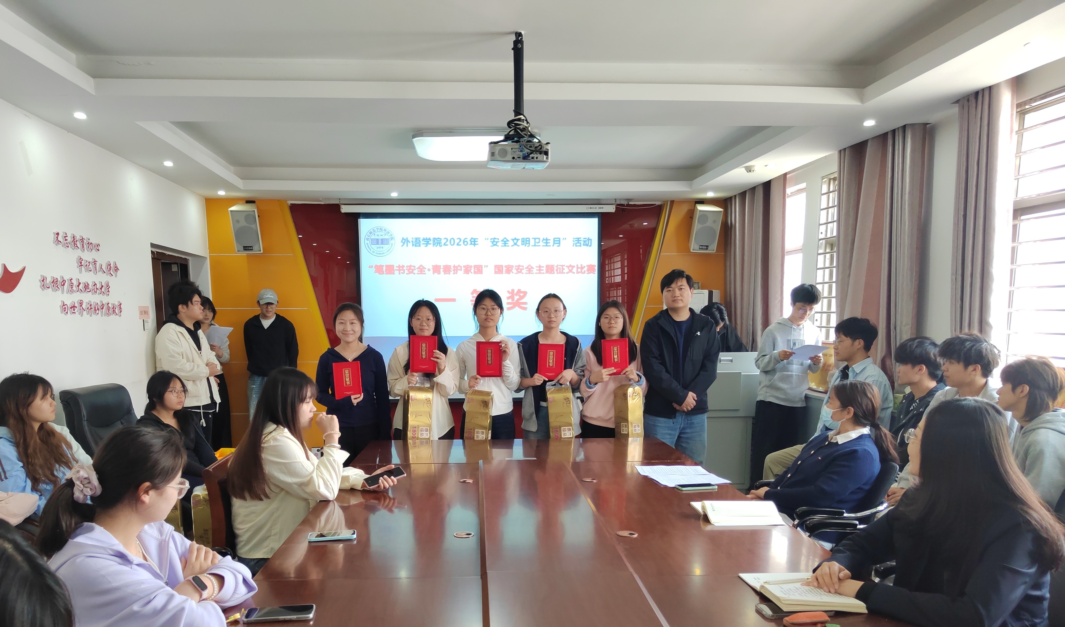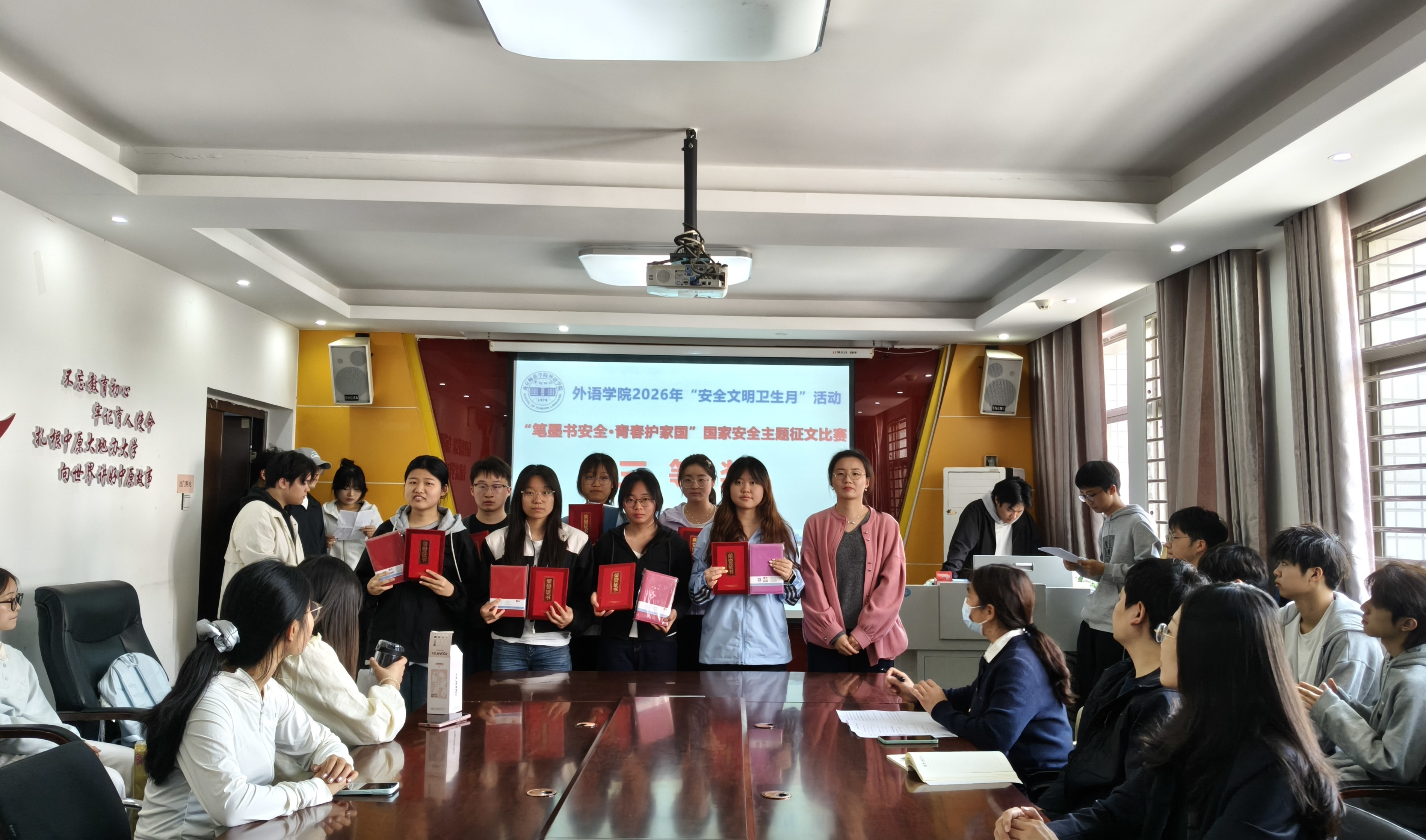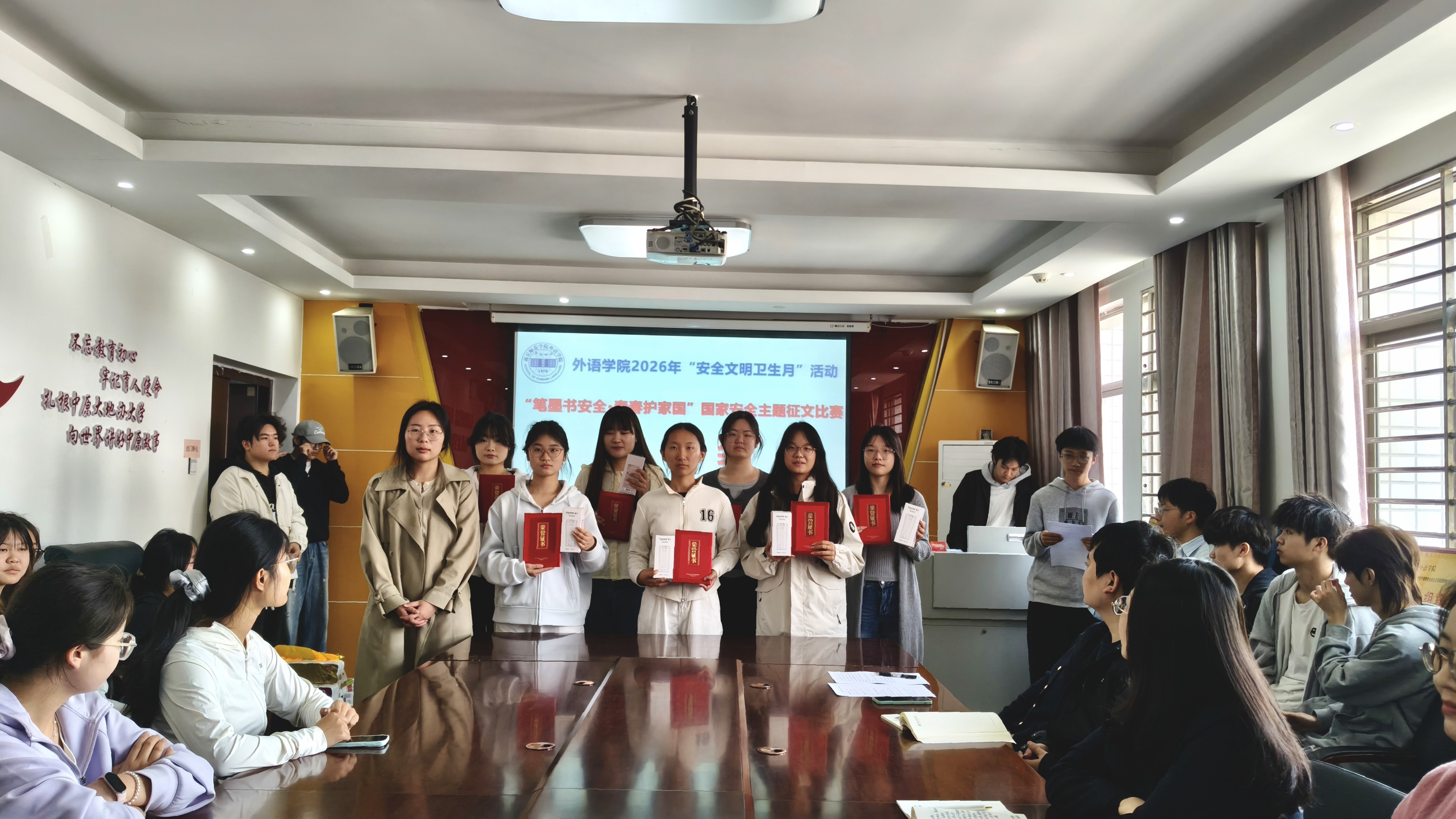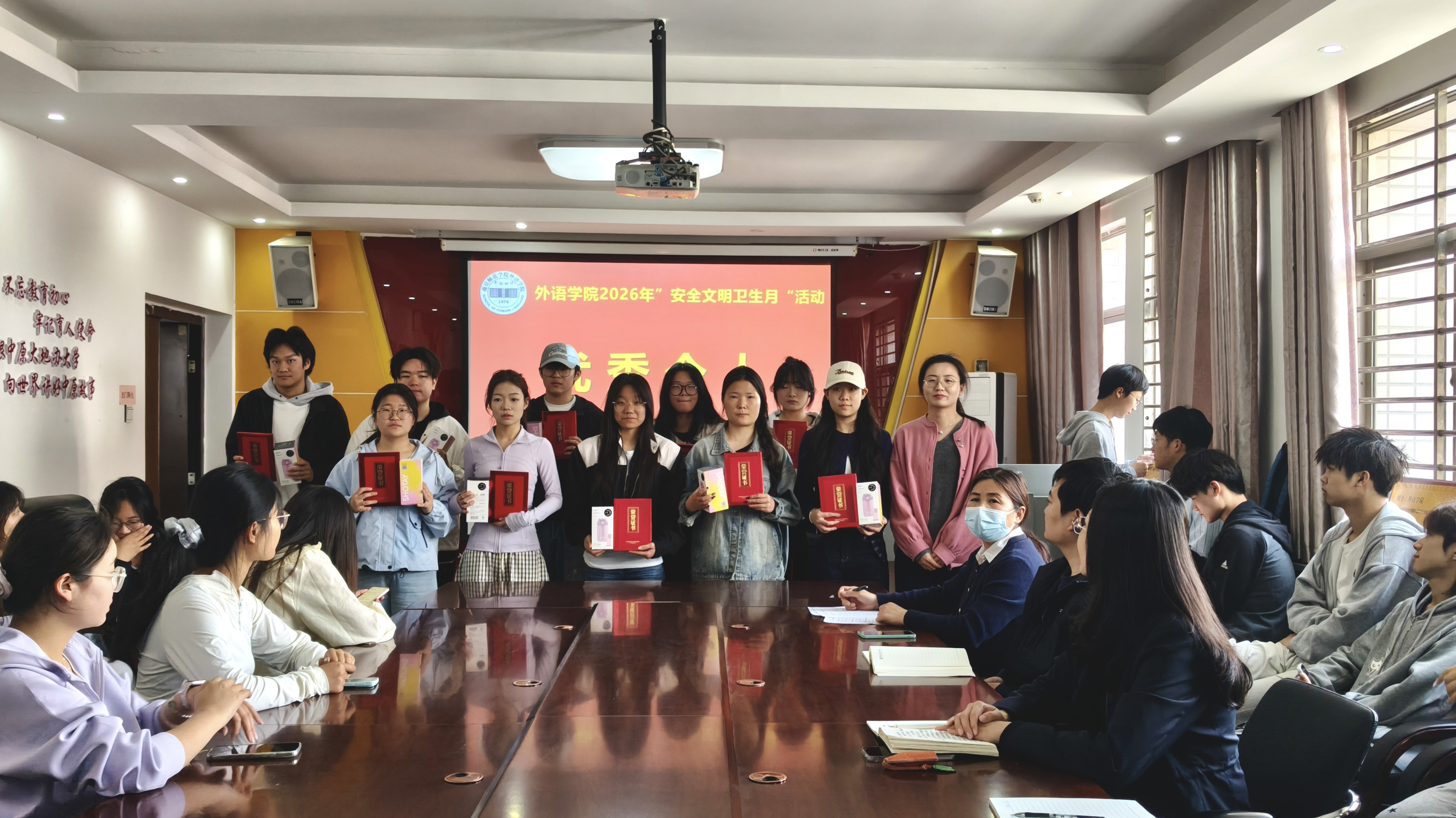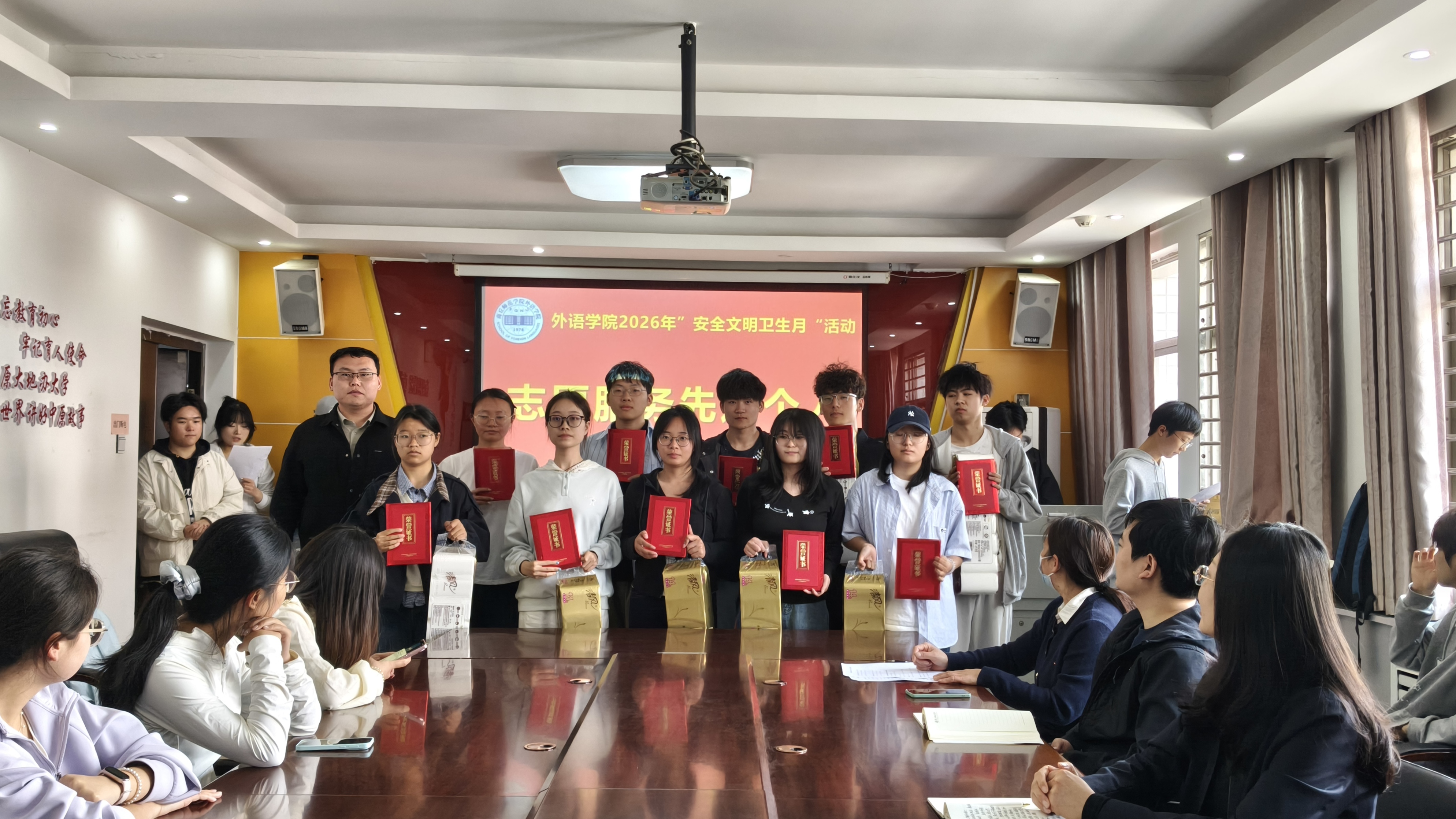 会议首先宣读了《william威廉中文关于表彰2026年“安全文明卫生月”活动获奖集体和个人的决定》,表彰了在活动中表现突出的优秀个人、志愿服务先进个人、“笔墨书安全·青春护家国”国家安全主题征文比赛获奖个人以及“十佳宿舍”。随后,与会领导老师依次为受到表彰的集体和个人颁发流动红旗、荣誉证书及奖品。