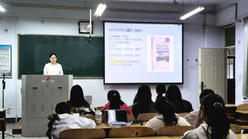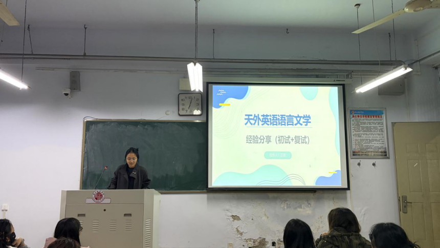 4月9日晚上,学院首先举办英语语言文学方向考研经验分享会。成功上岸天津外国语大学、四川外国语大学、辽宁大学、河南大学的王琪、贵琳、徐畅、刘丹四位同学结合自身备考经历,从择校定位、复习规划、专业课备考、复试准备等方面进行了详细讲解。王琪围绕天津外国语大学报考特点,重点介绍了二外日语及专业课的备考方法;贵琳结合文化方向备考经历,分享了复习策略与心态调整经验;徐畅围绕学硕大综合科目,系统讲解了时间规划与复习路径;刘丹则结合自身“逆袭”经历,强调尽早定校、精准备考和复试的重要性。