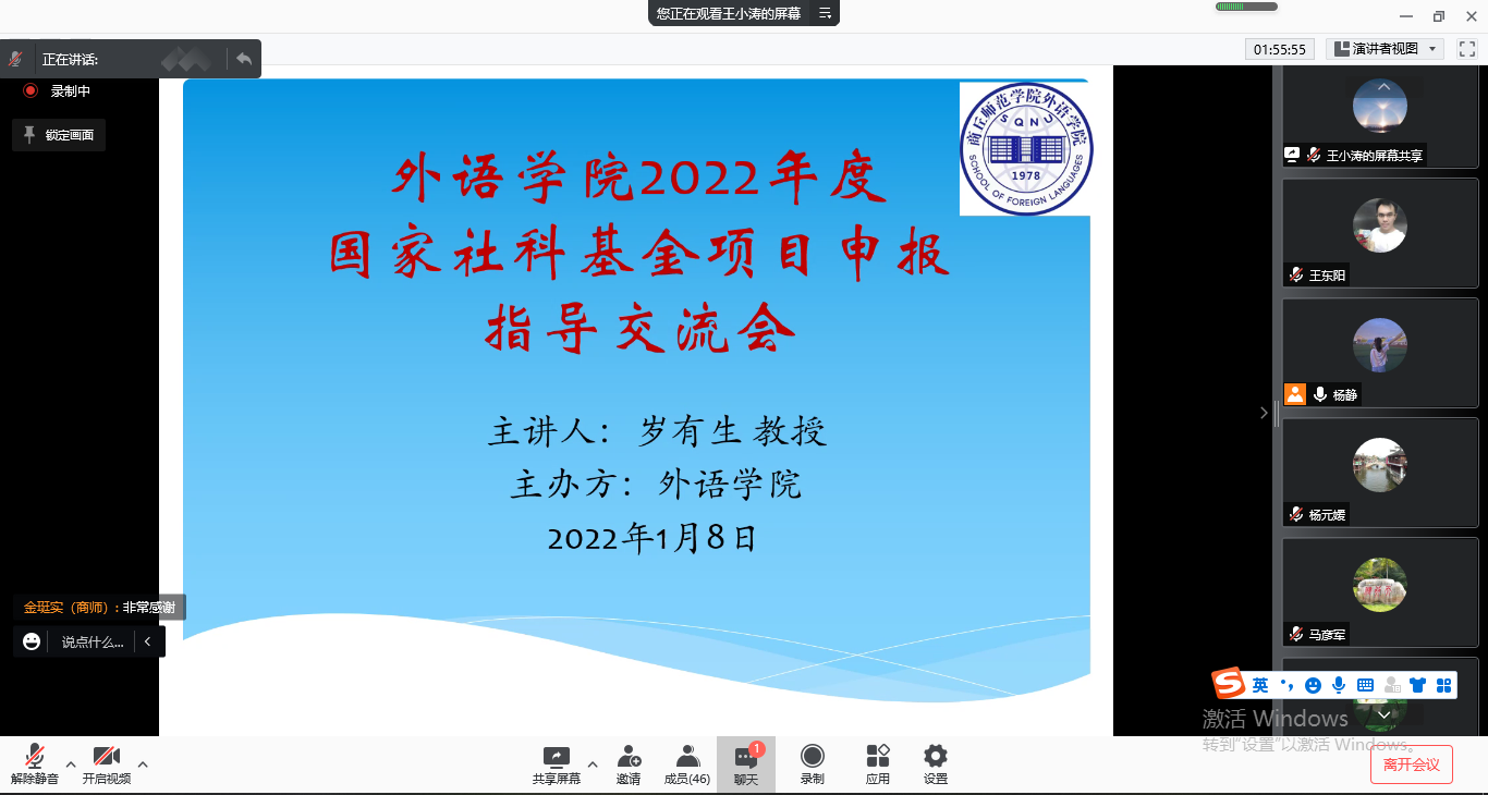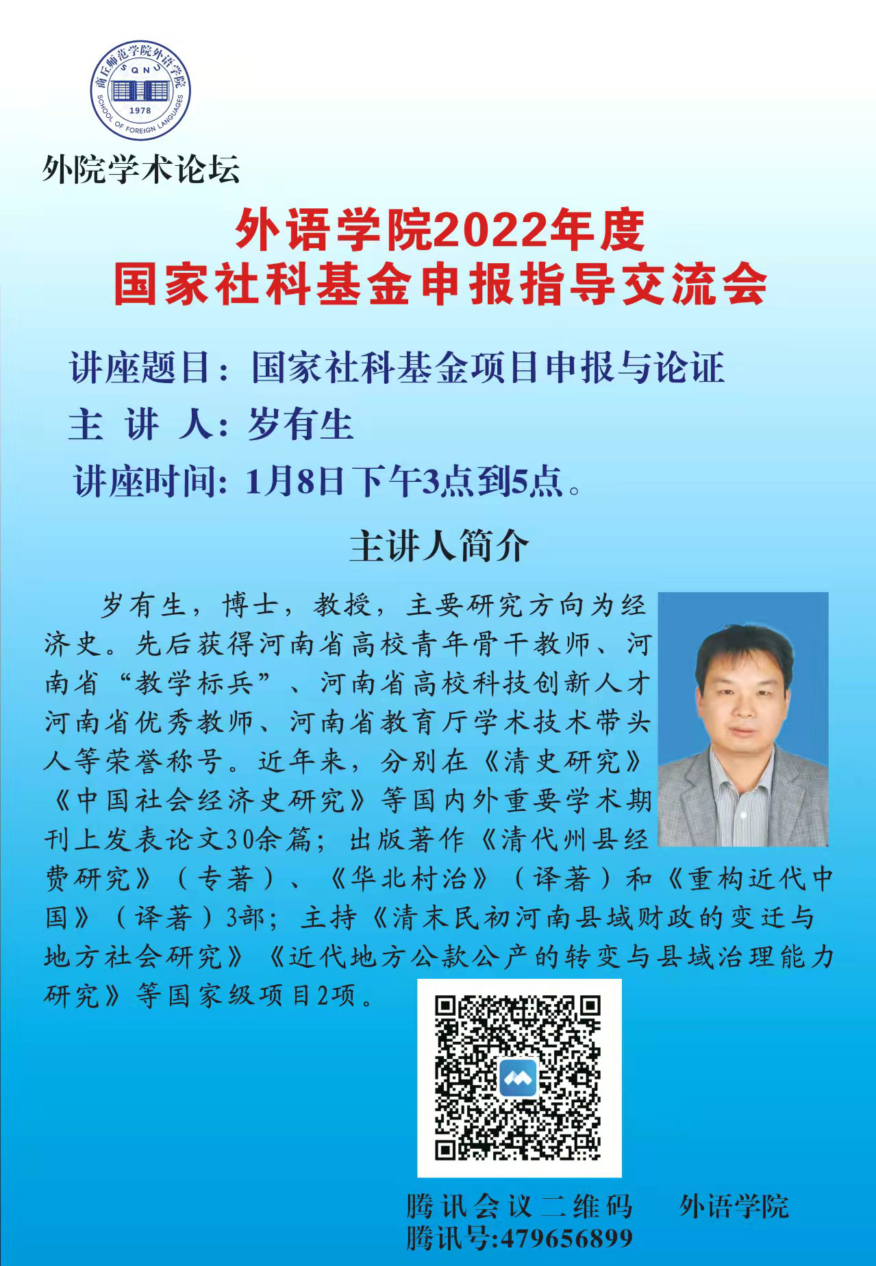 2022年1月8日下午3点到5点,应william威廉中文邀请,WilliamHill中文岁有生教授在腾讯会议网络平台为我院教师做了“国家社科基金项目申报与论证”的专题讲座,william威廉中文副院长杨静博士主持会议,william威廉中文院长孙艳玲教授带领外院教师聆听了此次讲座。