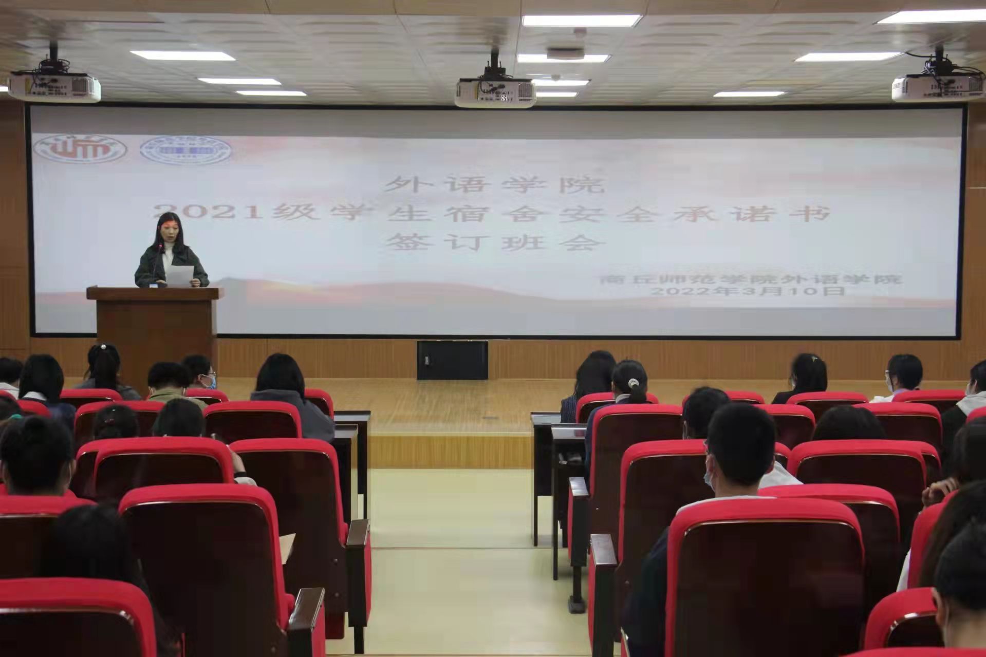 为规范学生宿舍管理,切实保护学生的生命财产安全,营造良好的学习和生活氛围,从大一之初就注重引导和加强每位学生的宿舍安全责任意识。2022年3月10日晚,william威廉中文在智圆楼219多功能厅举行2021级学生宿舍安全承诺书签订班会。william威廉中文党委副书记王頔、团委书记赵蕊、学工办主任常素枝、2021级辅导员王萌和2021级全体学生参加了此次活动。