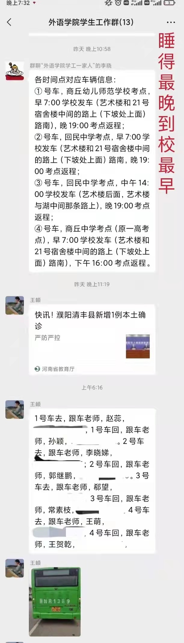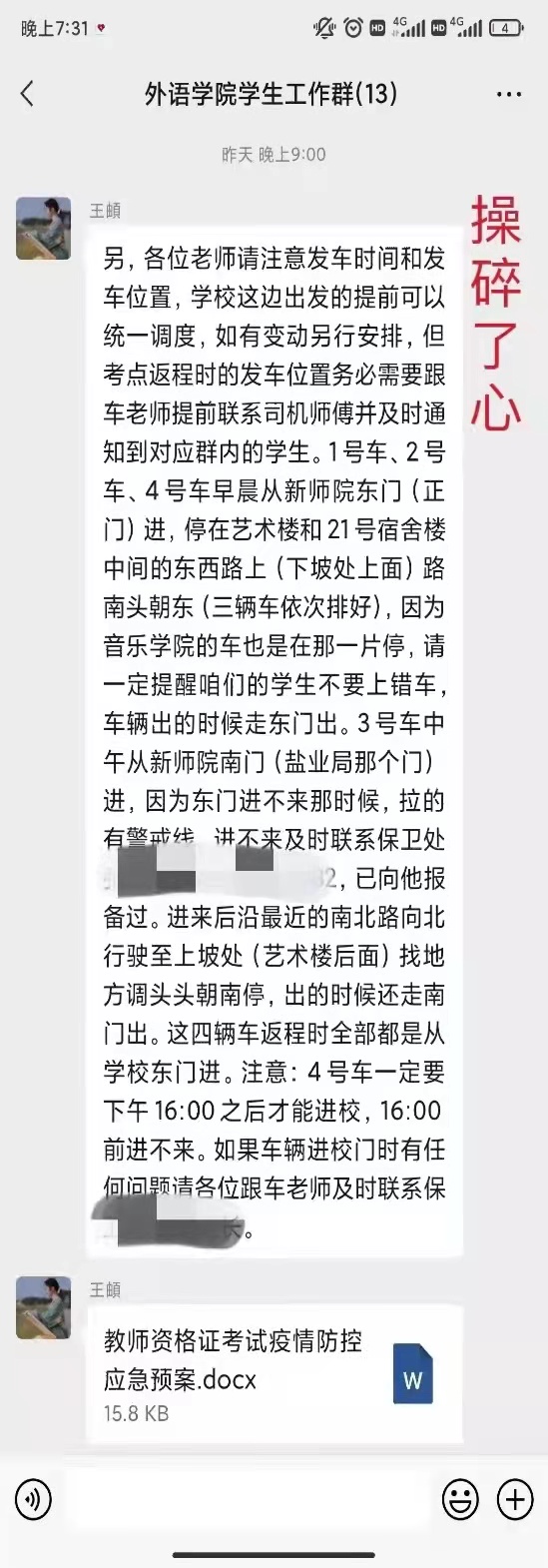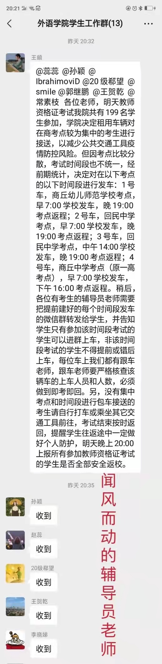 为严格落实校学生处《 关于做好教师资格证考试期间学生疫情防控工作的通知》,william威廉中文在党政领导班子的安排布署下,学工队伍闻风而动,全力以赴,确保底数清、情况明、无遗漏,明确专人负责,点对点提供服务,确保每位考生安全到达教资考点和顺利返校。