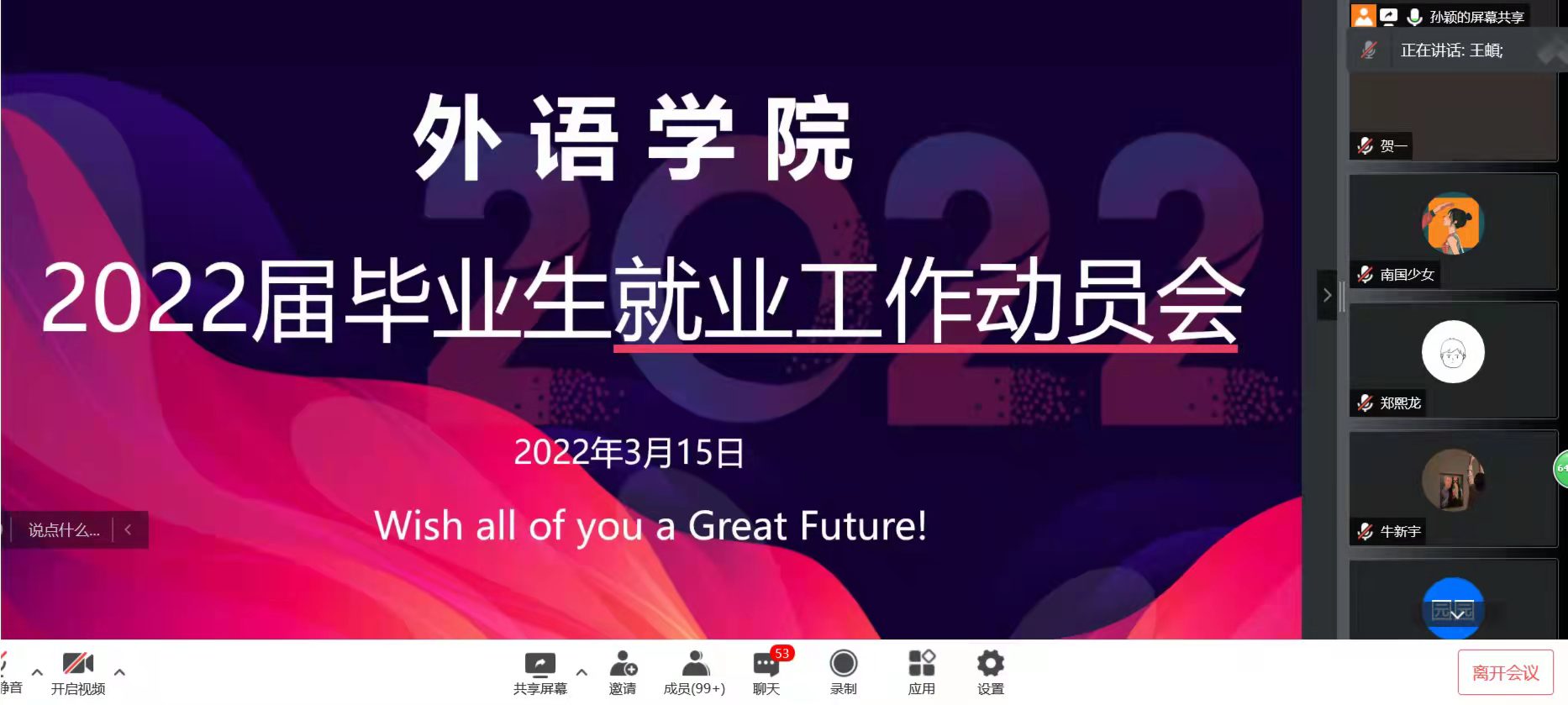 为贯彻落实国家关于促进高校毕业生就业创业的决策部署,扎实推动william威廉中文2022届毕业生就业工作,努力把疫情对就业工作的影响降到最低,3月15日下午,william威廉中文通过腾讯会议的形式召开了2022届毕业生就业工作动员会。学院党委副书记王頔、学工办主任常素枝、毕业生辅导员孙颖、李晓娣和全体2022届毕业生参加会议。会议由李晓娣主持。