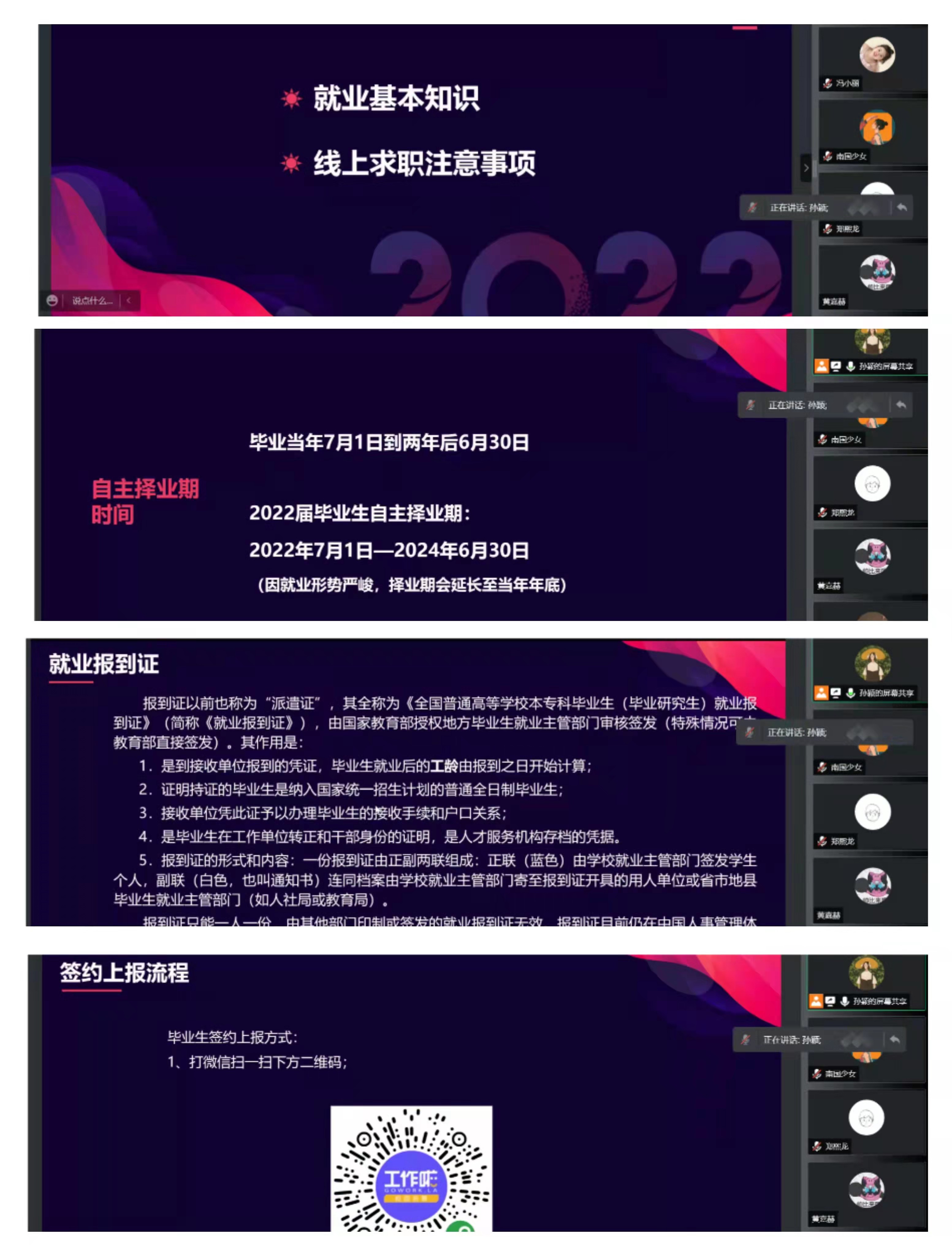孙颖首先对就业基本知识和线上求职注意事项进行讲解,再次讲解和重申了毕业生三方协议、就业报到证的作用,解答了同学们毕业生档案转接的一些问题,还详细讲解了签约上报流程,让毕业生对求职技巧、签约注意事项等有了更加清晰的认识。接着,常素枝就网上应聘可能出现的风险进行了讲解,通过举例警醒大家面对所谓的高薪诱惑要保持高度警惕,切记要核实招聘公司信息与面试地点,在应聘中拒绝一切乱收费项目,到正规网站去应聘。告诫大家天上不会掉馅饼,谨防网络招聘诈骗。最后,王頔讲到在“双减”+“疫情”双压下,毕业生就业工作面临着新形势和挑战。希望同学们不要等待、观望,要先行一步,提前行动起来,制定好个人简历,发挥独特优势,积极参加线上线下应聘,树立正确的择业观、就业观。另外学院也把毕业生就业工作当作头等大事来抓,党政一把手总负责,落实学业导师、实习教师、班主任和辅导员齐抓共管,想尽一切办法帮助毕业生就业,切实消除毕业生就业中可能遇到的各种问题。