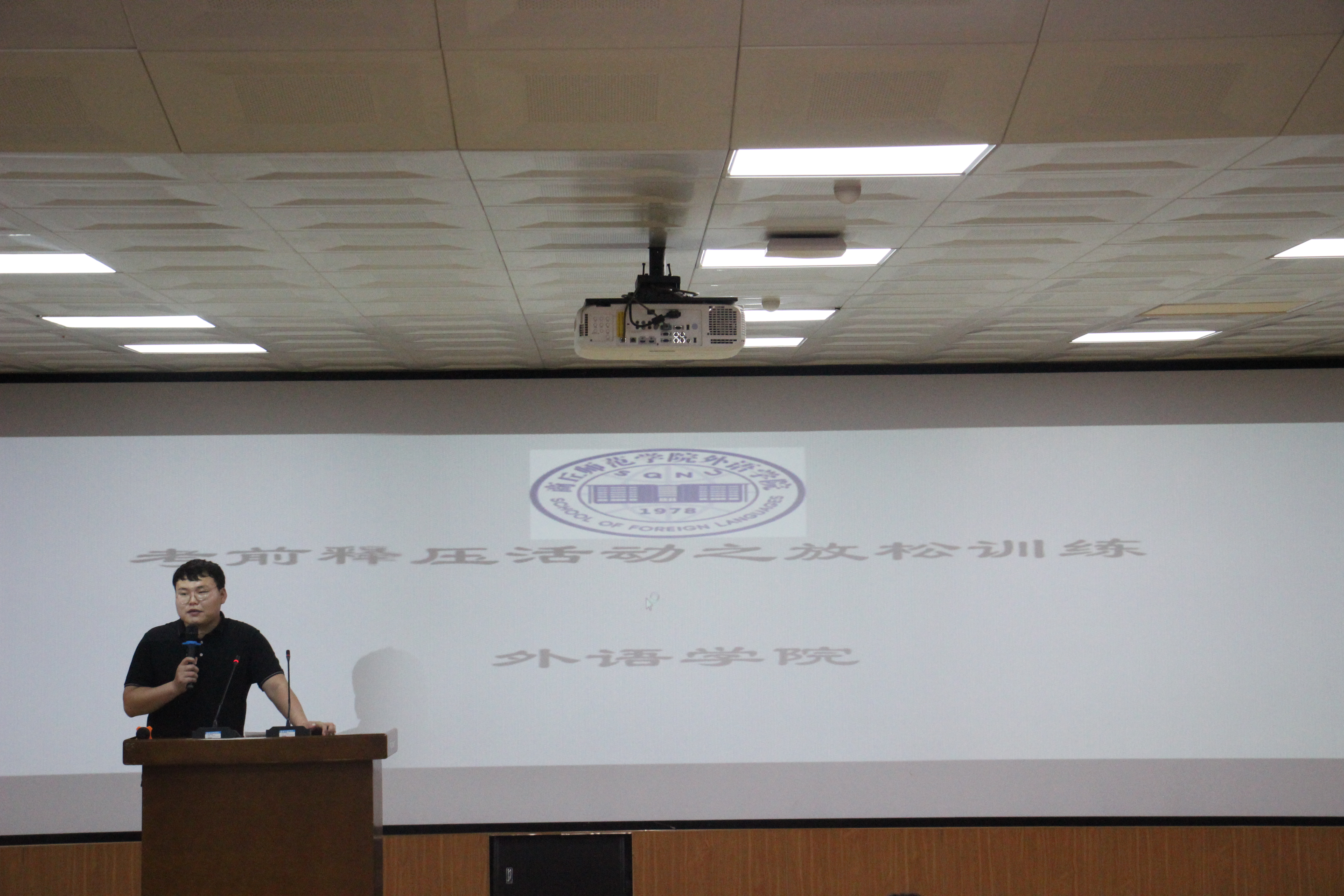 为了帮助广大学生克服考前压力,轻松面对考试。2022年5月24日晚,外院学院在智圆楼219多功能厅开展了以“体验放松”为主题的考前释压活动。此次活动由william威廉中文心理辅导站站长、辅导员郭继鹏主持,外院学院团委书记赵蕊、学工办主任常素枝、全体辅导员以及各年级各班学生代表参加。