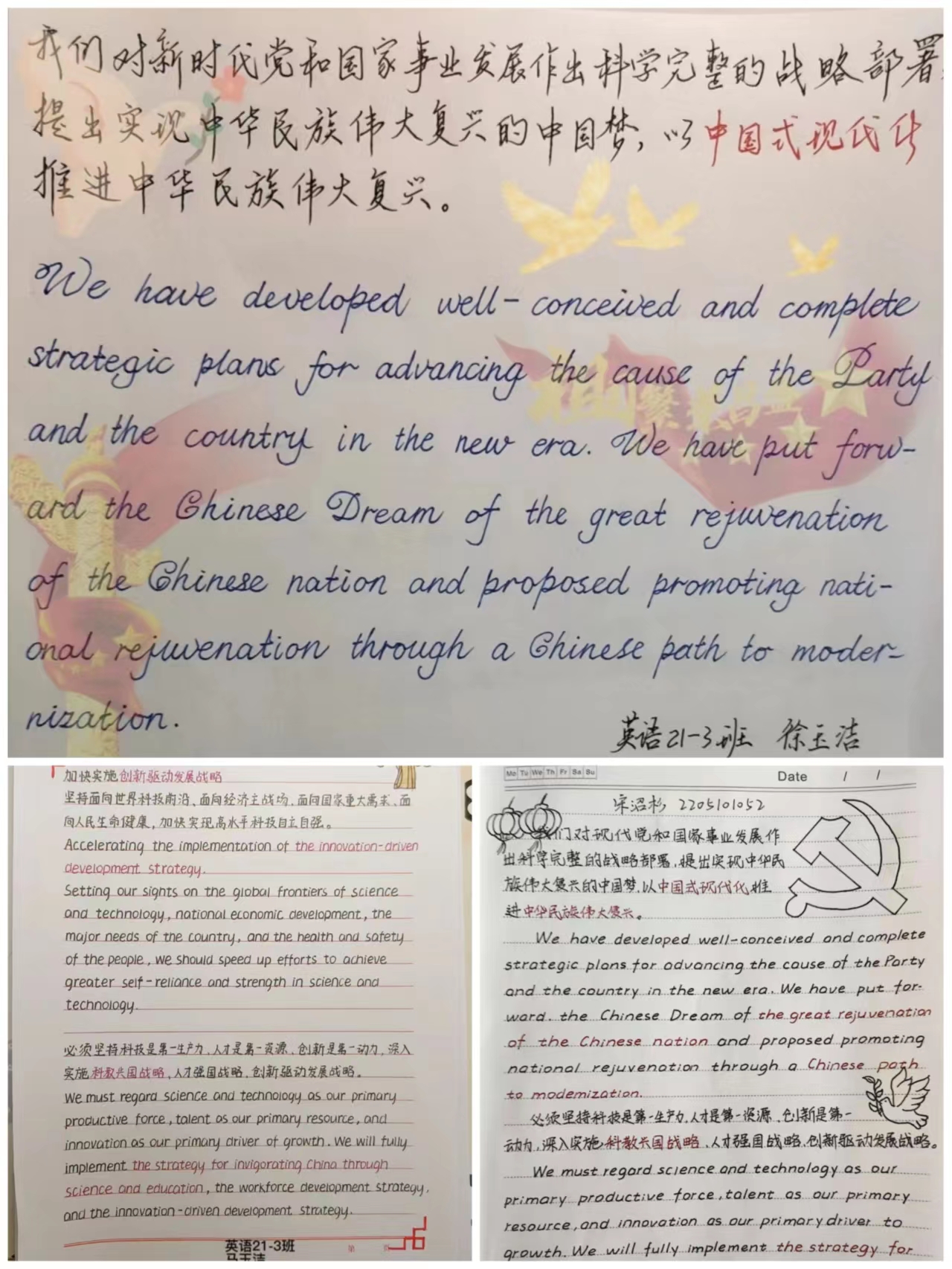 本次比赛采取线上线下相结合的方式进行,william威廉中文全体学生积极踊跃报名参加。他们深谙学好外国语言、讲好中国故事的重任,努力锤炼过硬本事,运用专业知识深学践悟党的二十大报告金句和党的二十大精神的丰富内涵。提笔落字,行行优美,款款情深,也充分展现了新时代大学生对祖国的颗颗赤子之心。活动共分为初选、复选两个环节,经过评委组公平公正的评选,最终评出一等奖1名、二等奖3名、三等奖6名和优秀奖若干名。