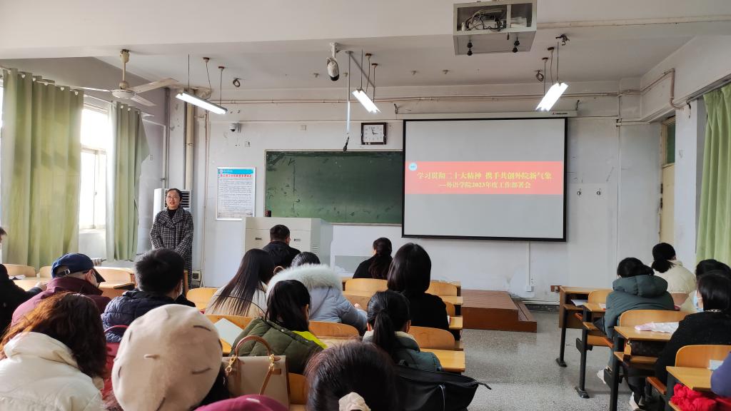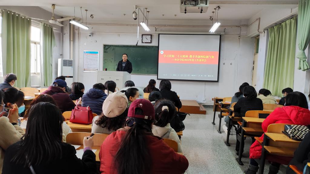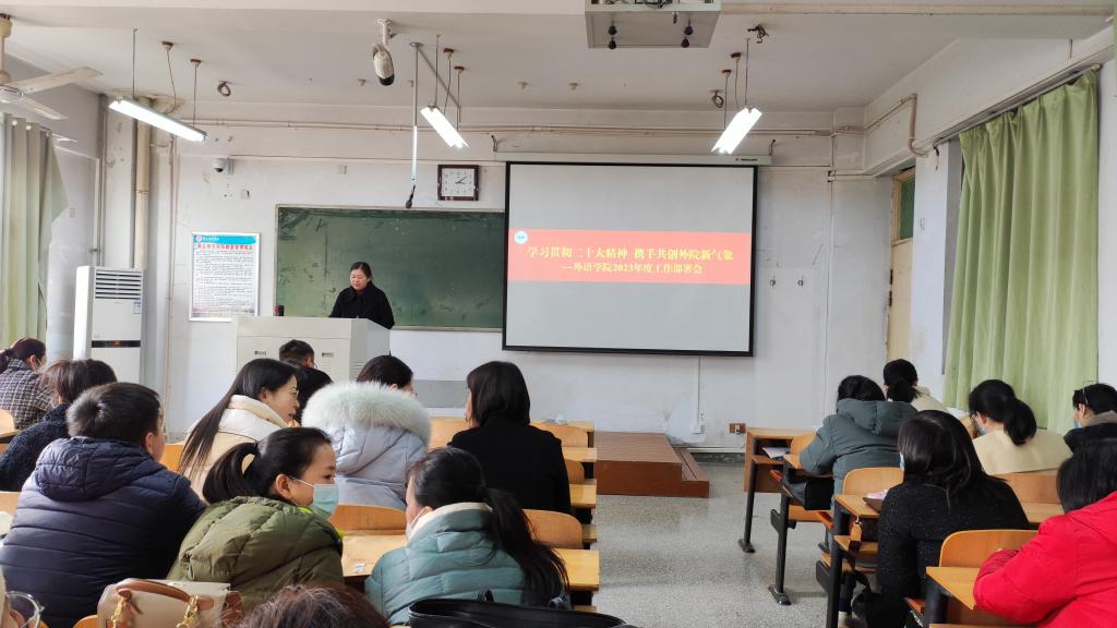 院长孙艳玲回顾了2022年主要工作,并部署2023年重点工作任务,肯定成绩,分析了学院发展面临的诸多机遇与挑战。2023年全院要紧扣学校工作部署要求,明确主攻方向和重点任务,着力抓好英语师范专业认证、学科评估、专业学科竞赛、人才队伍建设等重点工作,推进各项改革走深走实,奋力开创外语工作新局面。