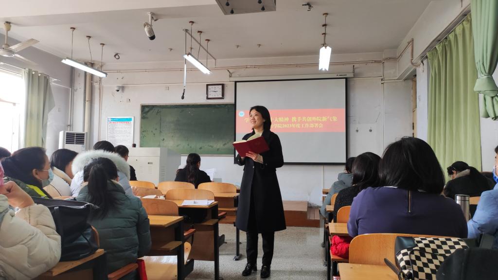 党委书记韩坤指出,2023年是全面贯彻落实党的二十大精神的开局之年,全院要坚持以习近平新时代中国特色社会主义思想为指导,紧扣学习宣传贯彻党的二十大精神主线,凝聚发展共识,满怀信心开好局、起好步,以高质量党建引领学院事业高质量发展,携手共创外院新气象。