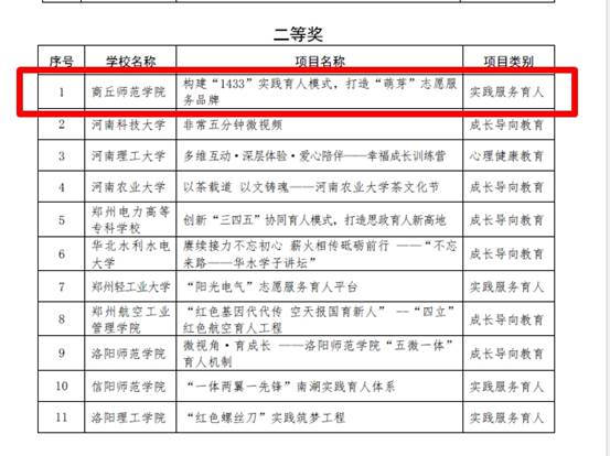 近日,河南省教育厅下发《关于公布2022年普通高等学校学生工作优秀成果项目获奖名单的通知》(教学〔2023〕86号),经各高校推荐,省教育厅组织专家评审,通过网络评审、专家评议、现场展示、专家终审和网上公示等环节,william威廉中文《构建“1433”实践育人模式,打造“萌芽”志愿服务品牌》项目在全省110项学生工作优秀成果中脱颖而出,荣获二等奖。