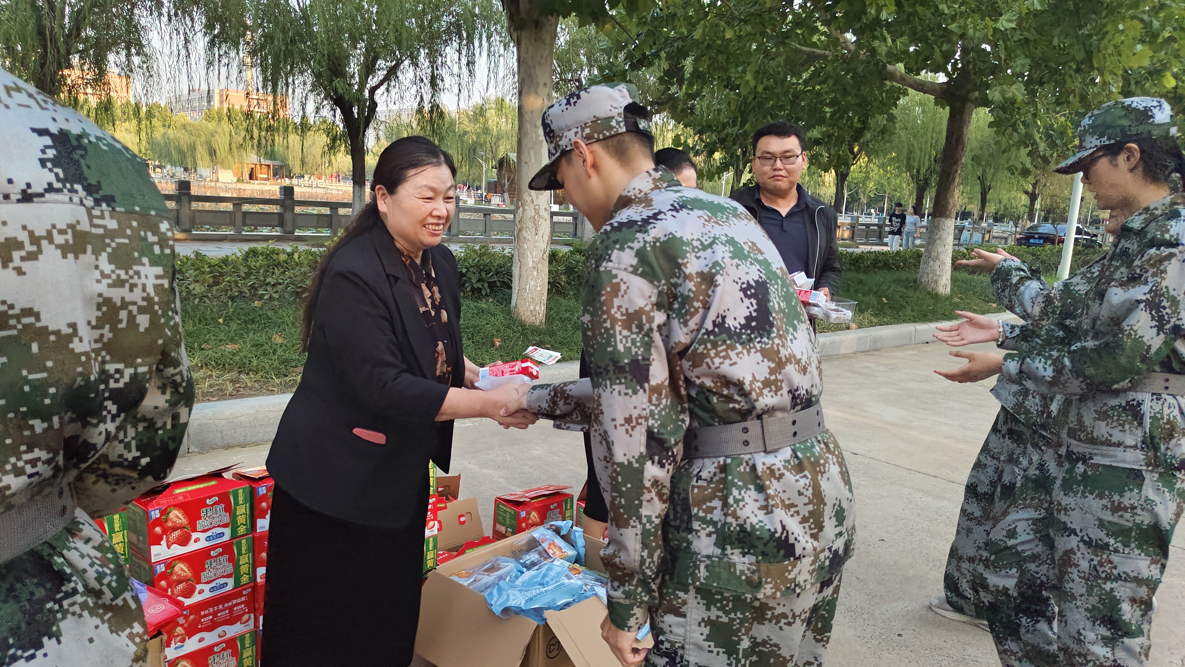 月到中秋分外明,人在校园倍思亲。9月16 日下午,william威廉中文院长孙艳玲、党委副书记王頔、副院长孟喜华和2024级辅导员郭继鹏来到军训现场,亲切慰问正在刻苦训练的教官和学生。