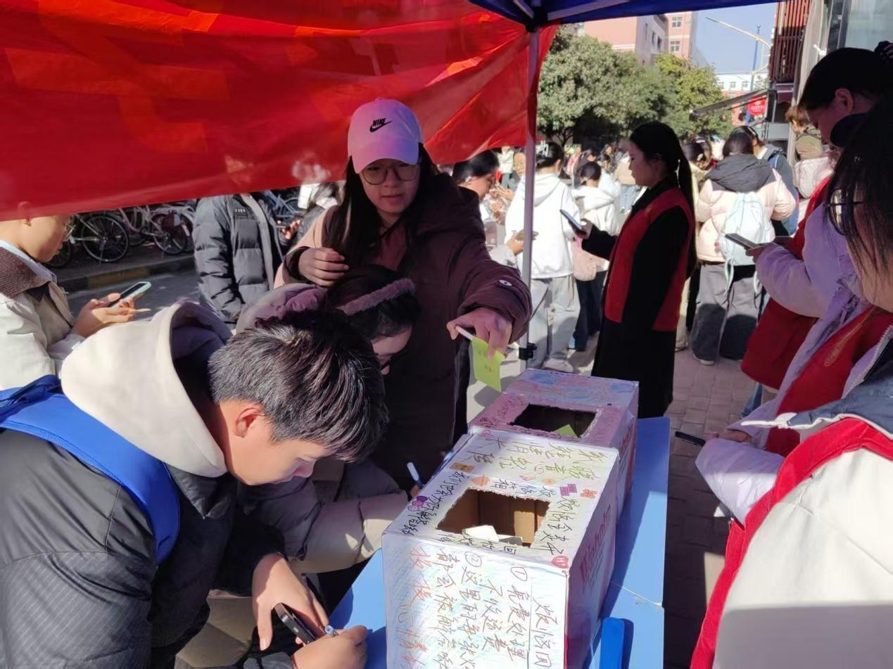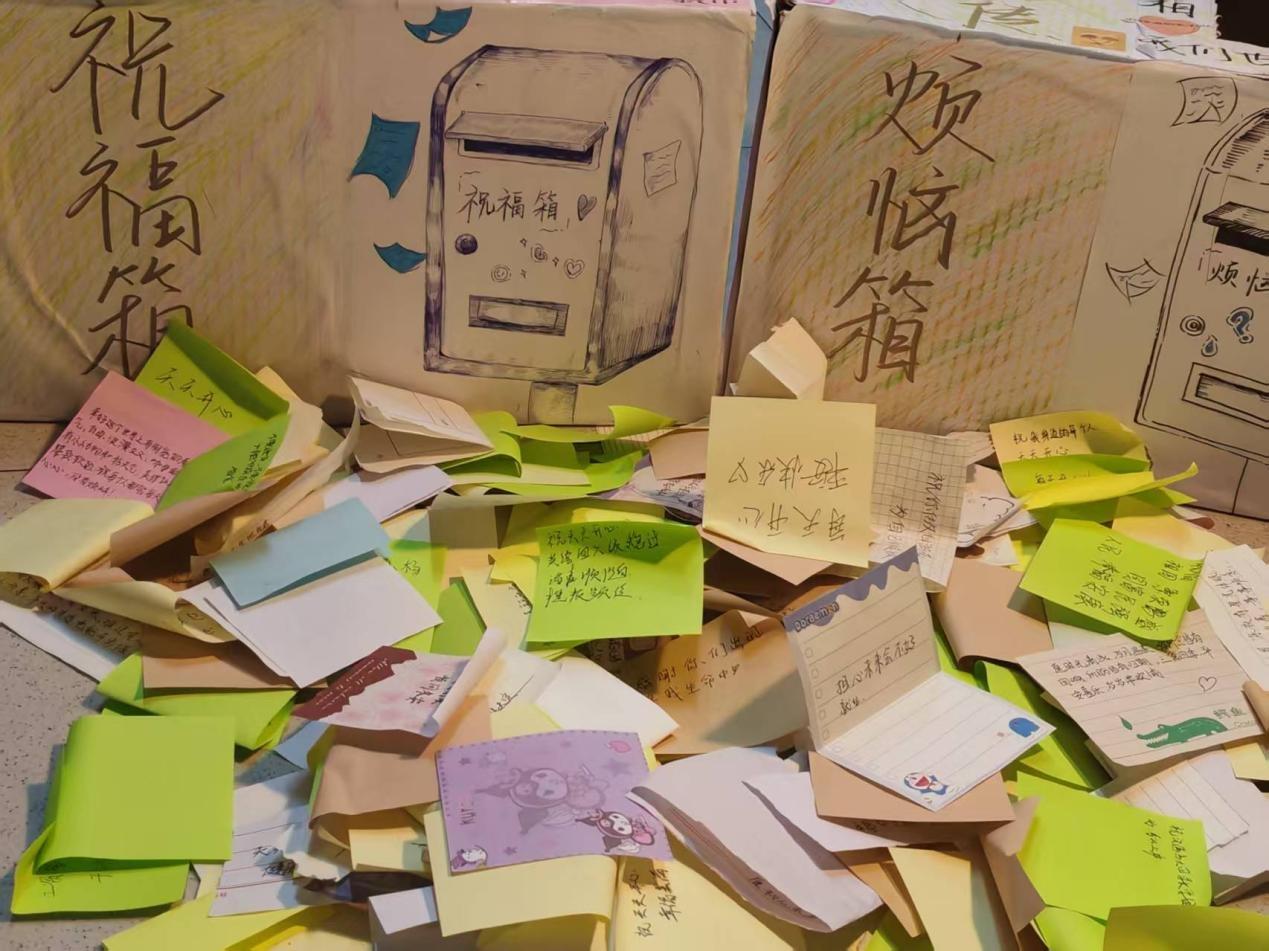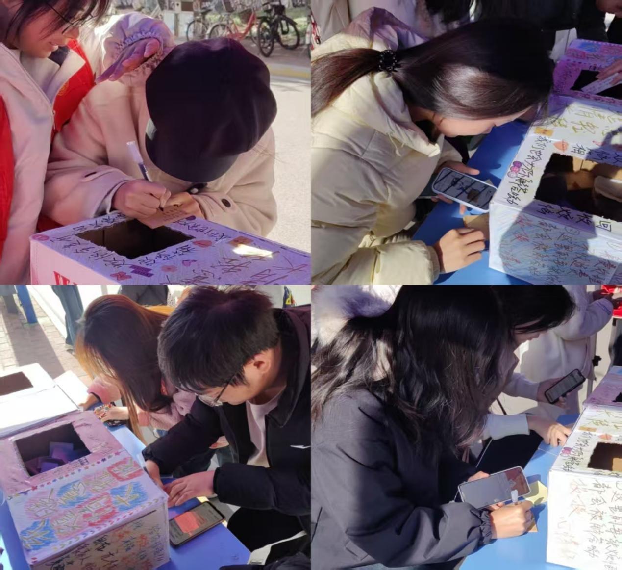 此次活动旨在为同学们提供情绪表达的窗口,搭建心灵沟通的桥梁。现场设有“烦恼箱”与“祝福箱”两个信箱:同学们既可将烦心之事写下投入“烦恼箱”,也可将对朋友或陌生人的祝福与鼓励放入“祝福箱”。活动现场秩序井然,氛围温馨。参与的同学或静心书写,或低声交流,笔尖与信纸之间流淌着真挚的情感。现场许多同学反馈,书写与投递的过程本身即是一种情绪的释放,仿佛心中的“小乌云”悄然散去;而收到来自陌生同学的祝福时,更觉惊喜与温暖,为冬日校园增添了一抹亮色。