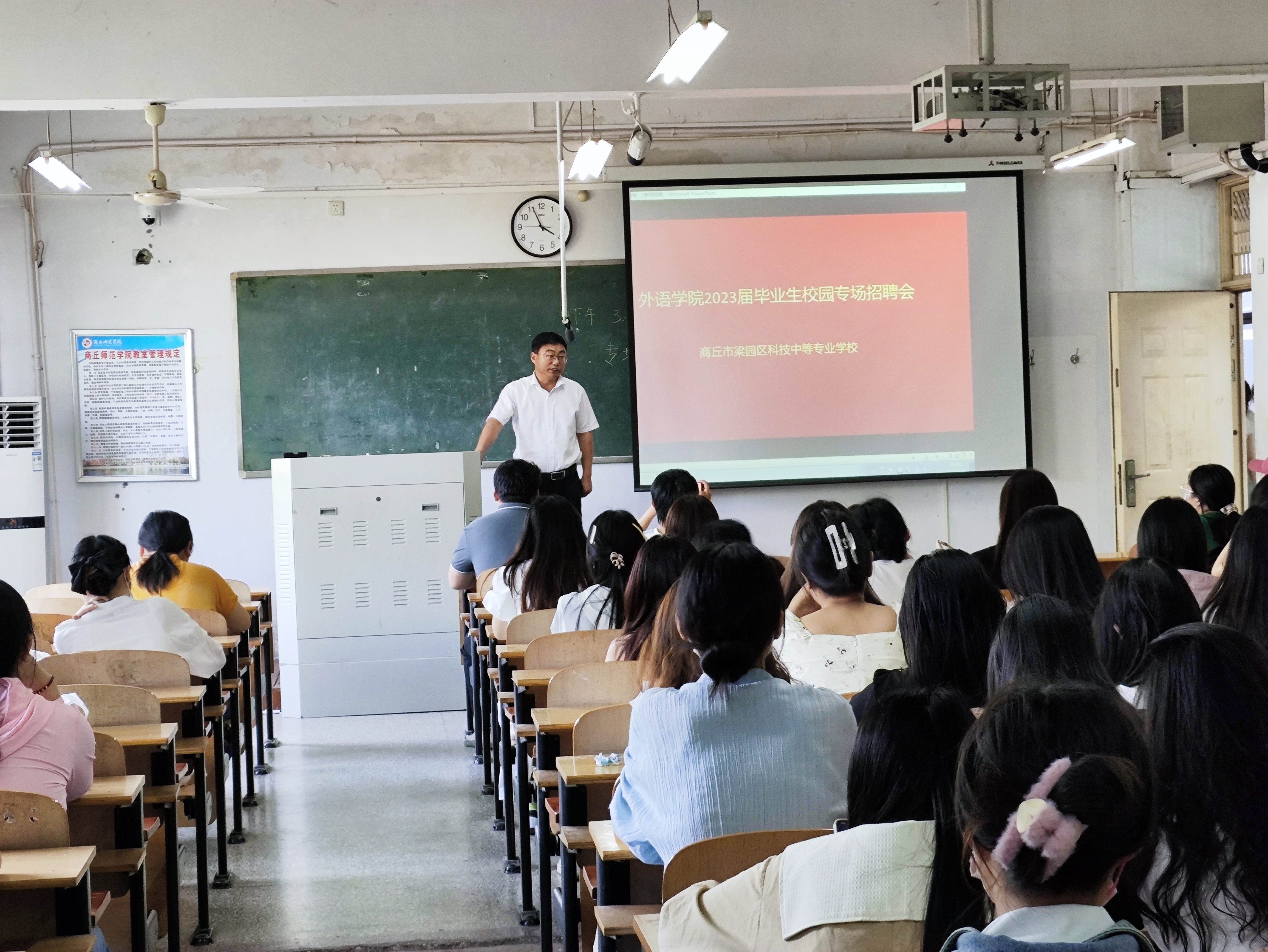 为促进2023届毕业生充分就业,提升就业服务质量,推动就业工作平稳运行。6月7日下午,william威廉中文于梁园校区智圆楼215教室举行2023届毕业生校园专场招聘会,本次招聘会由辅导员郭继鹏老师主持,2023届英语专业毕业生100余人参加,用人单位为商丘市梁园区科技中等专业学校。